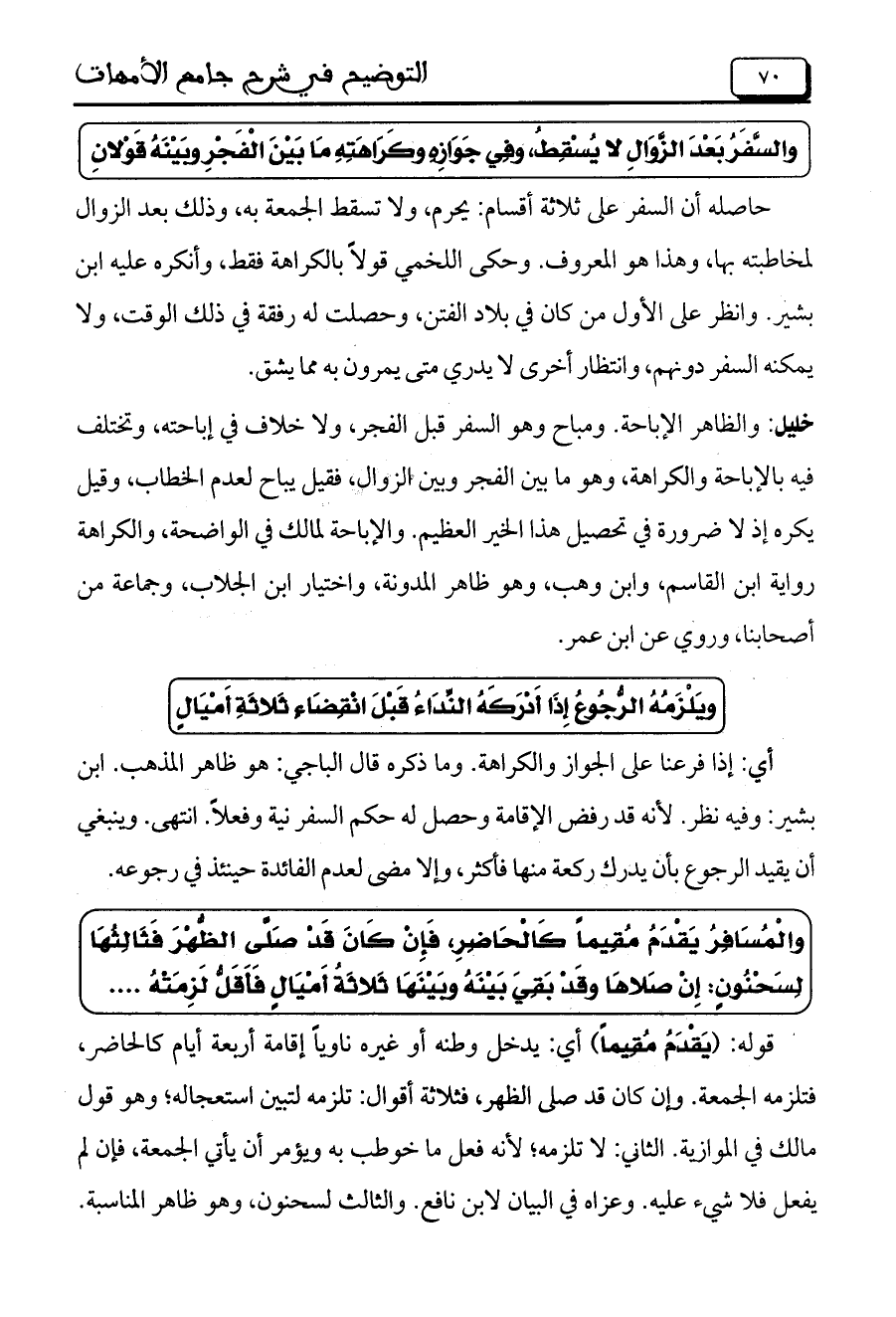 حاصله أن السفر على ثلاثة أقسام: يحرم، ولا تسقط الجمعة به، وذلك بعد الزوال لمخاطبته بها، وهذا هو المعروف. وحكى اللخمي قولاً بالكراهة فقط، وأنكره عليه ابن بشير. وانظر على الأول من كان في بلاد الفتن، وحصلت له رفقة في ذلك الوقت، ولا يمكنه السفر دونهم، وانتظار أخرى لا يدري متى يمرون به مما يشق.