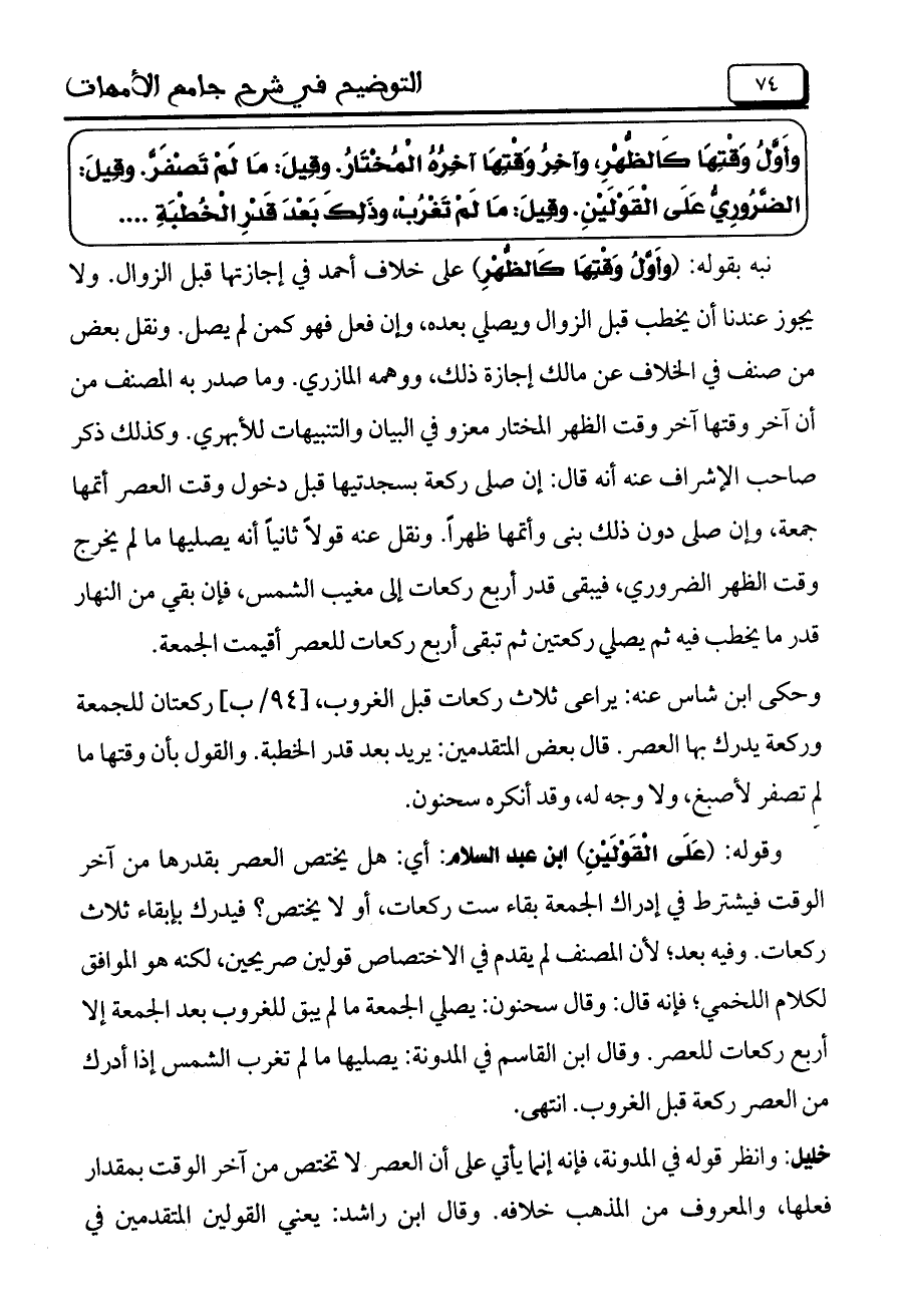 نبه بقوله: (وَأوَّلُ وَقْتِهَا كَالظُّهْرِ) على خلاف أحمد في إجازتها قبل الزوال. ولا يجوز عندنا أن يخطب قبل الزوال ويصلي بعده، وإن فعل فهو كمن لم يصل. ونقل بعض من صنف في الخلاف عن مالك إجازة ذلك، ووهمه المازري. وما صدر به المصنف من أن آخر وقتها آخر وقت الظهر المختار معزو في البيان والتنبيهات للأبهري. وكذلك ذكر صاحب الإشراف عنه أنه قال: إن صلى ركعة بسجدتيها قبل دخول وقت العصر أتمها جمعة، وإن صلى دون ذلك بنى وأتمها ظهراً. ونقل عنه قولاً ثانياً أنه يصليها ما لم يخرج وقت الظهر الضروري، فيبقى قدر أربع ركعات إلى مغيب الشمس، فإن بقي من النهار قدر ما يخطب فيه ثم يصلي ركعتين ثم تبقى أربع ركعات للعصر أقيمت الجمعة.
