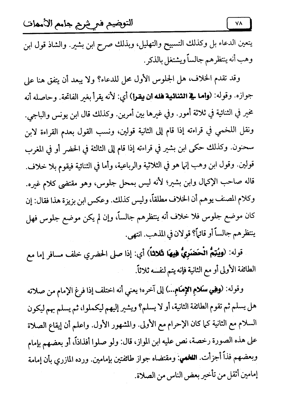 وقد تقدم الخلاف، هل الجلوس الأول محل للدعاء؟ ولا يبعد أن يتفق هنا على جوازه. وقوله: (وأما في الثنائية فله أن يقرأ) أي: لأنه يقرأ بغير الفاتحة. وحاصله أنه مخير في الثنائية في ثلاثة أمور. وفي غيرها بين أمرين. وكذلك قال ابن يونس والباجي. ونقل اللخمي في قراءته إذا قام إلى الثانية قولين، ونسب القول بعدم القراءة لابن سحنون. وكذلك حكي ابن بشير في قراءته إذا قام إلى الثالثة في الحضر أو في المغرب قولين. وقول ابن وهب إنما هو في الثلاثية والرباعية، وأما في الثنائية فيقوم بلا خلاف. قاله صاحب الإكمال وابن بشير؛ لأنه ليس بمحل جلوس، وهو مقتضي كلام غيره. وكلام المصنف يوهم أن الخلاف مطلقاً، وليس كذلك. وعكس أبن بزيزة هذا فقال: إن كان موضع جلوس فلا خلاف أنه ينتظرهم جالساً، وإن لم يكن هوضع جلوس فهل ينتظرهم جالساً أو قائماً؟ قولان في المذهب. انتهى.