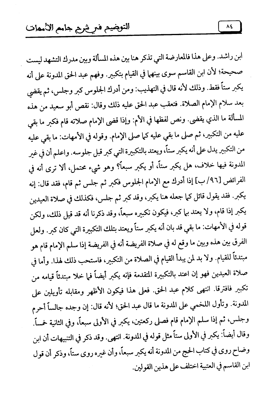 ابن راشد. وعلى هذا فالمعارضة التي تذكر هنا بين هذه المسألة وبين مدرك التشهد ليست صحيحة؛ لأن ابن القاسم سوى بينهما في القيام بتكبر. وفهم عبد الحق المدونة على أنه يكبر ستاً فقط. وذلك لأنه قال في التهذيب: ومن أدرك الجلوس كبر وجلس، ثم يقضي بعد سلام الإمام الصلاة. فتعقب عبد الحق عليه ذلك وقال: نقص أبو سعيد من هذه المسألة ما الذي يقضي. ونص لفظها في الأم: وإذا قضى الإمام صلاته قام فكبر ما بقي عليه من التكبير، ثم صلى ما بقي عليه كما صلى الإمام. وقوله في الأمهات: ما بقي عليه من التكبير يدل على أنه يكبر ستاً، ويعتد بالتكبيرة التي كبر قبل جلوسه. واعلم أن في غير المدونة فيها خلاف، هل يكبر ستاً، أو يكبر سبعاً؟ وهو شيء محتمل، ألا ترى أنه في الفرائض] 96/ب [إذا أدرك مع الإمام الجلوس فكبر ثم جلس ثم قام، فقد قال: إنه يكبر. فقد يقول قائل كما جعله هنا كبر، وقد كبر ثم جلس، فكذلك في صلاة العيدين يكبر إذا قام، ولا يعتد بما كبر، فيكون تكبيره سبعاً، وقد ذكرنا أنه قد قيل ذلك، ولكن قوله في الأمهات: ما بقي قد بان أنه يكبر ستاً ويعتد بتلك التكبيرة التي كان كبر. ولعل الفرق بين هذه وبين ما وقع له من صلاة الفريضة أنه في الفريضة إذا سلم الإمام قام هو مبتدئاً للقيام. ولابد لمن يبدأ القيام في الصلاة من التكبير، فاستحب ذلك لهذا. وأما في صلاة العيدين فهو إن اعتد بالتكبيرة المتقدمة فإنه يكبر أيضاً فما خلا مبتدئاً قيامه من تكبير فافترقا. انتهى كلام عبد الحق. فعلى هذا فيكون الأظهر ومقابله تأويلين على المدونة. وتأول اللخمي على المدونة ما قال عبد الحق؛ لأنه قال: إن وجده جالسا أحرم وجلس، ثم إذا سلم الإمام قام فصلى ركعتين، يكبر في الأولى سبعاً، وفي الثانية خمساً. وقال أيضاً: يكبر في الأولى ستاً مثل قوله في المدونة. انتهى. وقد ذكر في التنبيهات أن ابن وضاح روى في كتاب الحج من المدونة أنه يكبر سبعاً، وأن غيره روى ستاً، وذكر أن قول ابن القاسم في العتبية اختلف على هذين القولين.
