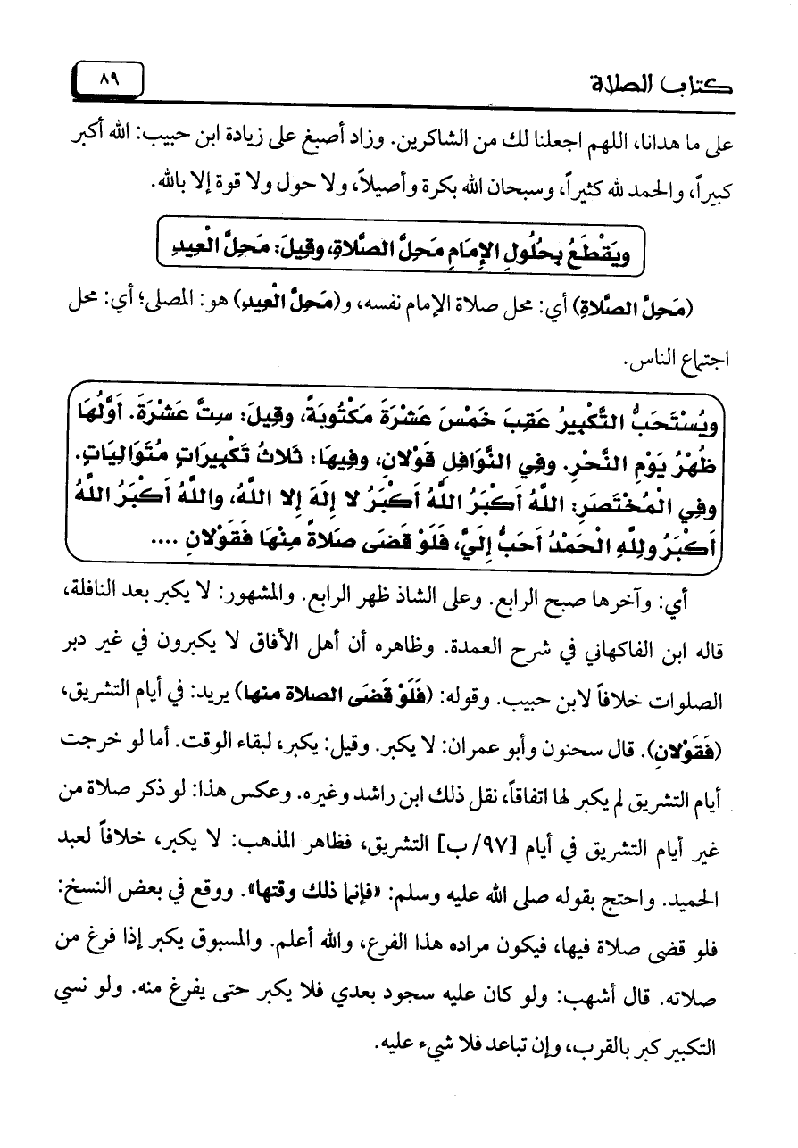 ويُسْتَحَبُّ التَّكْبِيرُ عَقِبَ خَمْسَ عَشْرَةَ مَكْتُوبَةً، وقِيلَ: سِتَّ عَشْرَةَ. أَوَّلُهَا ظُهْرُ يَوْمِ النَّحْرِ. وفِي النَّوَافِل قَوْلانِ، وفِيهَا: ثَلاثُ تَكْبيرَاتٍ مُتَوَالِيَاتٍ. وفِي الْمُخْتَصَرِ: اللهُ أَكْبَرُ اللهُ أَكْبَرُ لا إِلَهَ إِلا اللهُ، واللهُ أَكْبَرُ اللهُ أَكْبَرُ ولِلهِ الْحَمْدُ أَحَبُّ إِلَيَّ، فَلَوْ قَضَي صَلاةً مِنْهَا فَقَوْلانِ ...