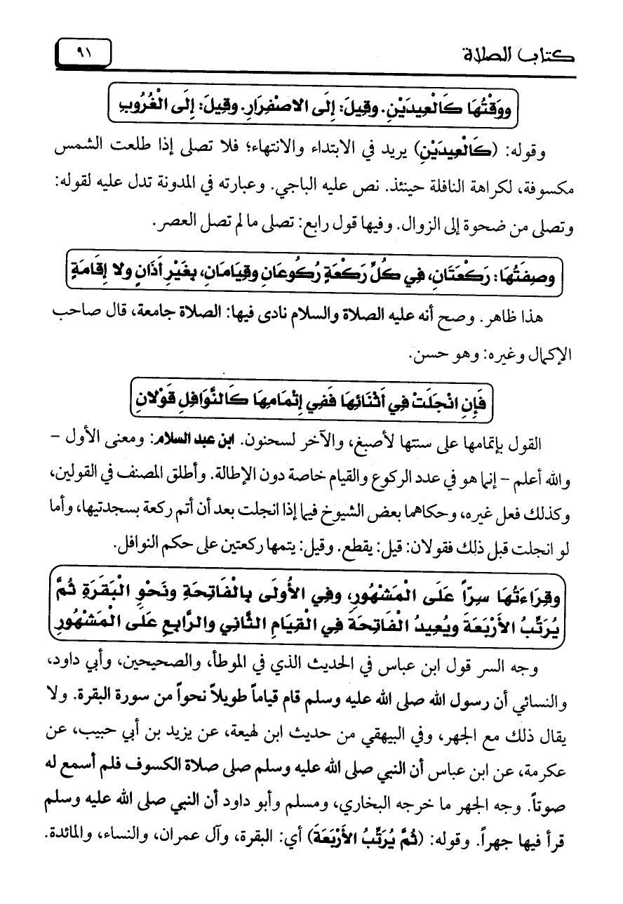 وقوله: (كَالْعِيدَيْنِ) يريد في الابتداء والانتهاء؛ فلا تصلي إذا طلعت الشمس مكسوفة، لكراهة النافلة حينئذ. نص عليه الباجي. وعبارته في المدونة تدل عليه لقوله: وتصلي من ضحوة إلى الزوال. وفيه قول رابع: تصلي ما لم تصل العصر.