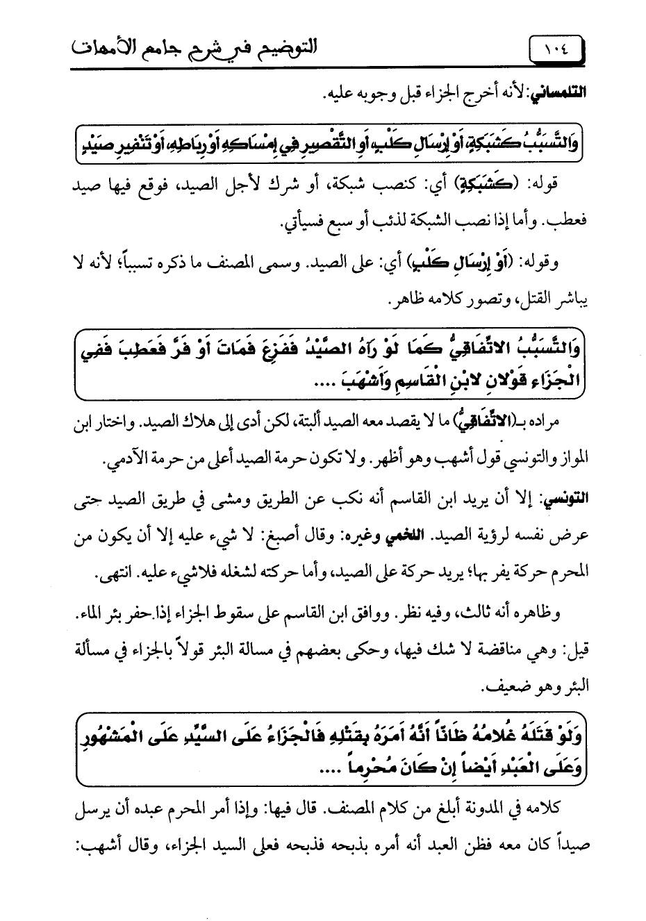 وَالتَّسَبُّبُ الاتِّفَاقِيُّ كَمَا لَوْ رَآهُ الصَّيْدُ فَفَزِعَ فَمَاتَ أَوْ فَرَّ فَعَطِبَ فَفِي الْجَزَاءِ قَوْلانِ لابْنِ الْقَاسِمِ وَأَشْهَبَ ....