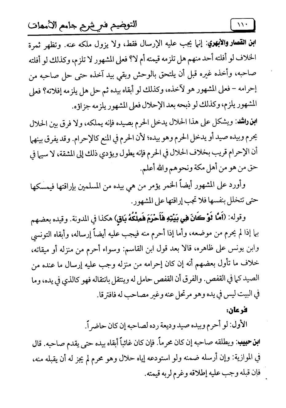 ابن راشد: ويشكل على هذا الحلال يدخل الحرم بصيده فإنه يملكه، ولا فرق بين الحلال يحرم وبيده صيد أو يدخل الحرم وهو بيده؛ لأن الحرم في المنع كالإحرام. وقد يفرق بينهما أن الإحرام قريب بخلاف الحلال في الحرم فإنه يطول ويؤدي ذلك إلى المشقة، لا سيما في حق من هو من أهل مكة ونحوهم والله أعلم.