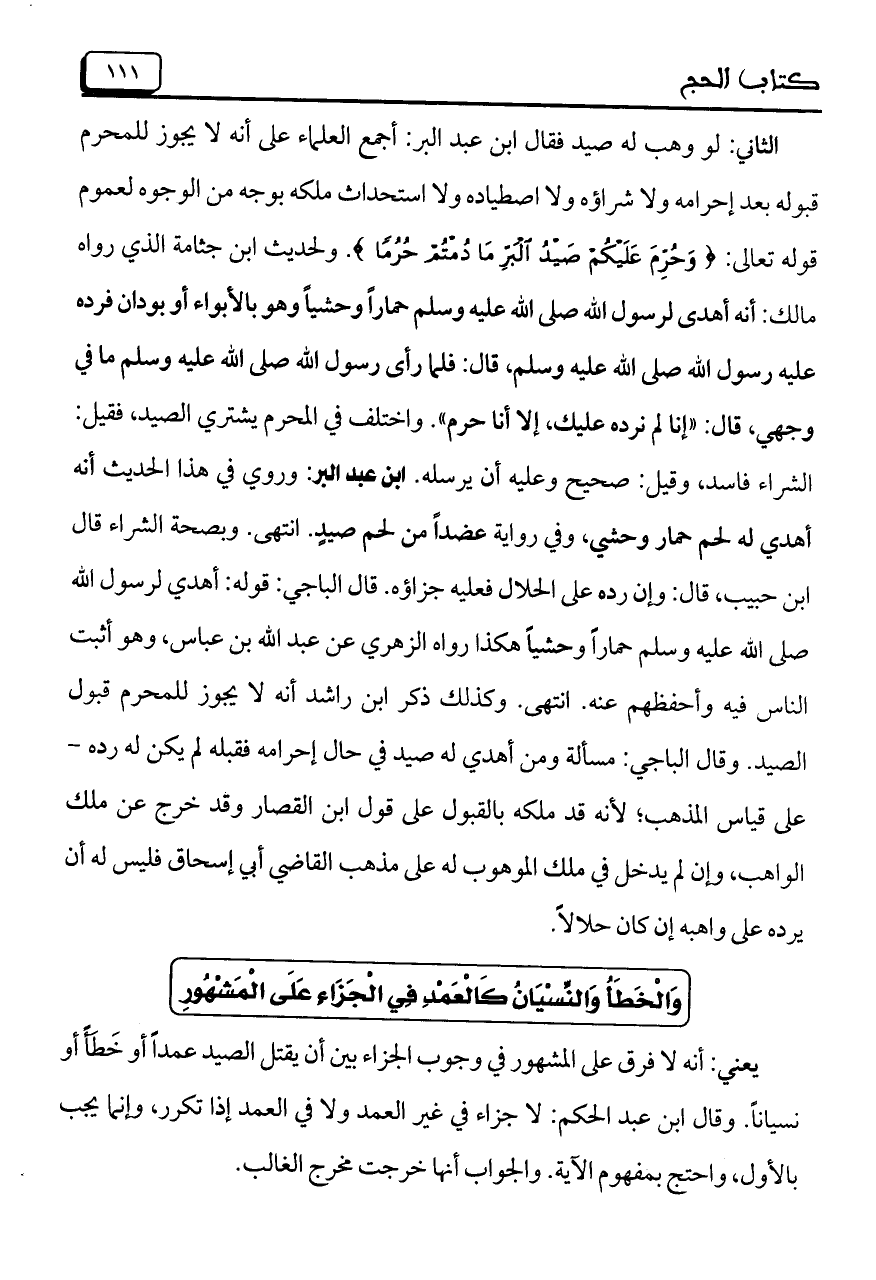 الثاني: لو وهب له صيد فقال ابن عبد البر: أجمع العلماء على أنه لا يجوز للمحرم قبوله بعد إحرامه ولا شراؤه ولا اصطياده ولا استحداث ملكه بوجه من الوجوه لعموم قوله تعالى: (حُرِّمَ عَلَيْكُمْ صَيْدُ الْبَرِّ مَا دُمْتُمْ حُرُماً (. ولحديث ابن جثامة الذي رواه مالك: أنه أحدى لرسول الله صلى الله عليه وسلم حمارا وحشيا وهو بالأبواء أو بودان فرده عليه رسول الله صلى الله عليه وسلم، قال: فلما رأى رسول الله صلى الله عليه وسلم ما في وجهي، قال: "إنا لم نرده عليك، إلا أنا حرم". واختلف في المحرم يشتري الصيد، فقيل: الشراء فاسد، وقيل: صحيح وعليه أن يرسله. ابن عبد البر: وروي في هذا الحديث أنه أهدي له لحم حمار وحشي، وفي رواية عضدا من لحم صيد. انتهى. وبصحة الشراء قال ابن حبيب، قال: وإن رده على الحلال فعليه جزاؤه. قال الباجي: قوله: أهدي لرسول الله صلى الله عليه وسلم حماراً وحشياً هكذا رواه الزهري عن عبد الله بن عباس، وهو أثبت الناس فيه وأحفظهم عنه. انتهى. وكذلك ذكر ابن راشد أنه لا يجوز للمحرم قبول الصيد. وقال الباجي: مسألة ومن أهدي له صيد في حال إحرامه فقبله لم يكن له رده – على قياس المذهب؛ لأنه قد ملكه بالقبول على قول ابن القصار وقد خرج عن ملك الواهب، وإن لم يدخل في ملك الموهوب له على مذهب القاضي أبي إسحاق فليس له أن يرده على واهبه إن كان حلالاً.