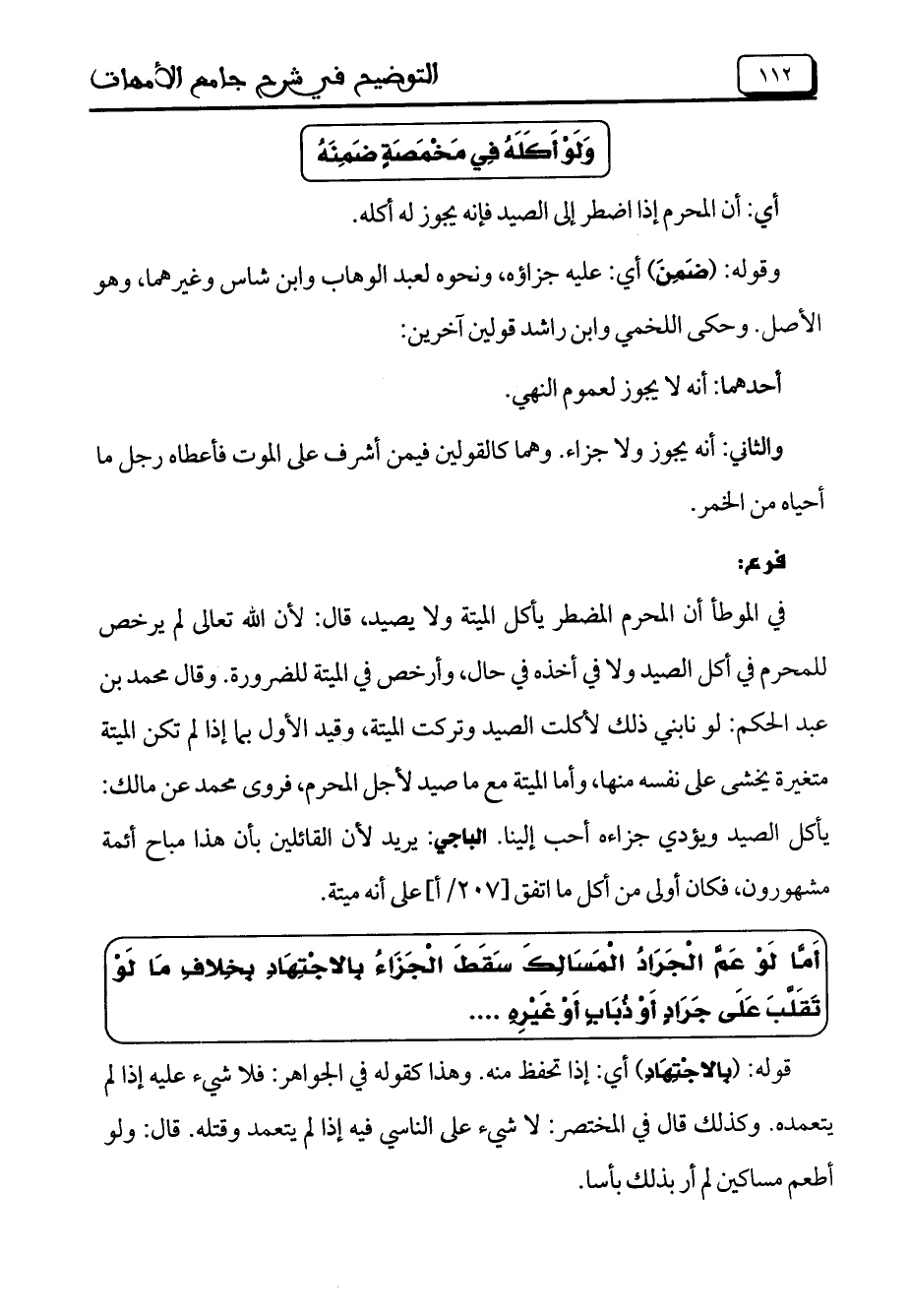 في الموطأ أن المحرم المضطر يأكل الميتة ولا يصيد، قال: لأن الله تعالى لم يرخص للمحرم في أكل الصيد ولا في أخذه في حال، وأرخص في الميتة للضرورة. وقال محمد بن عبد الحكم: لو نابني ذلك لأكلت الصيد وتركت الميتة، وقيد الأول بما إذا لم تكن الميتة متغيرة يخشى على نفسه منها، وأما الميتة مع ما صيد لأجل المحرم، فروى محمد عن مالك: يأكل الصيد ويؤدي جزاءه أحب إلينا. الباجي: يريد لأن القائلين بأن هذا مباح أئمة مشهورون، فكان أولى من أكل ما اتفق [207/أ] على أنه ميتة.
