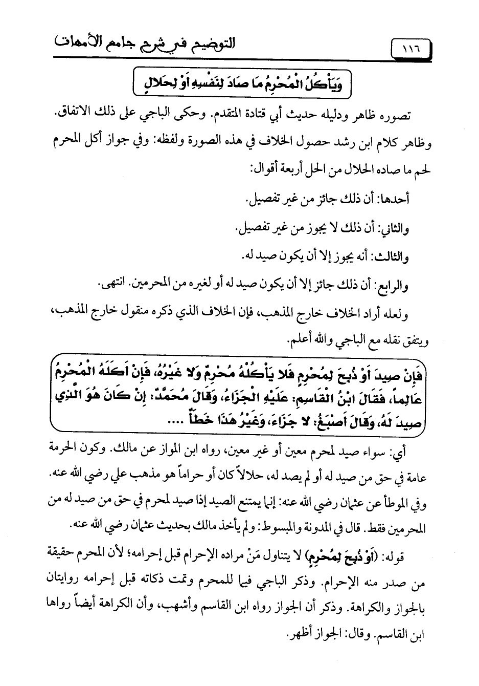 وَيَاكُلُ الْمُحْرِمُ مَا صَادَ لِنَفْسِهِ أَوْ لِحَلالٍ