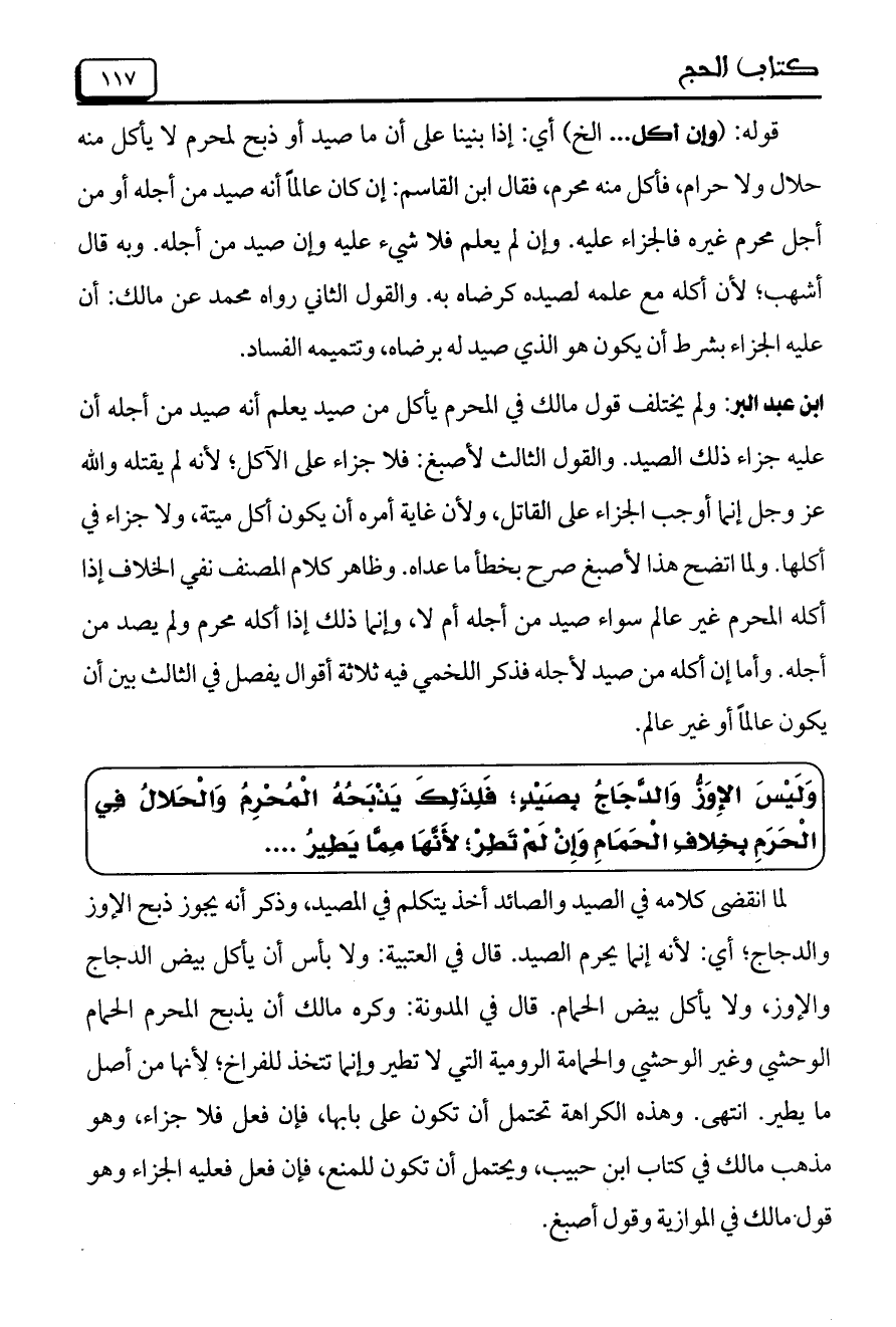ابن عبد البر: ولم يختلف قول مالك في المحرم يأكل من صيد يعلم أنه صيد من أجله أن عليه جزاء ذلك الصيد. والقول الثالث لأصبغ: فلا جزاء على الآكل؛ لأنه لم يقتله والله عز وجل إنما أوجب الجزاء على القاتل، ولأن غاية أمره أن يكون أكل ميتة، ولا جزاء في أكلها. ولما اتضح هذا لأصبغ صرح بخطأ ما عداه. وظاهر كلام المصنف نفي الخلاف إذا أكله المحرم غير عالم سواء صيد من أجله أم لا، وإنما ذلك إذا أكله محرم ولم يصد من أجله. وأما إن أكله من صيد لأجله فذكر اللخمي فيه ثلاثة أقوال يفصل في الثالث بين أن يكون عالما أو غير عالم.