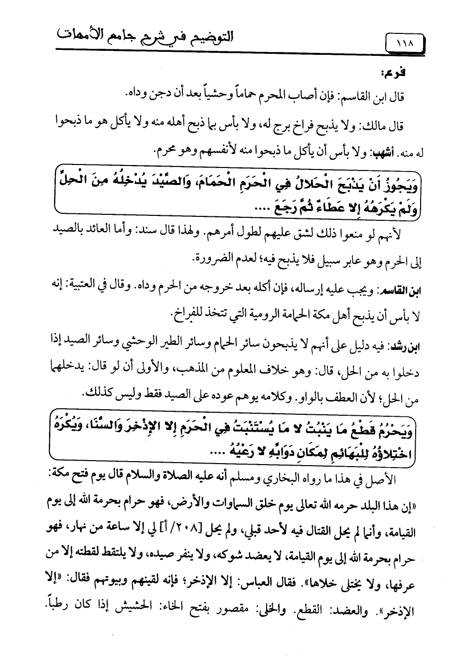 الأصل في هذا ما رواه البخاري ومسلم أنه عليه الصلاة والسلام قال يوم فتح مكة: "إن هذا البلد حرمه الله تعالى يوم خلق السماوات والأرض، فهو حرام بحمة الله إلى يوم القيامة، وأنما لم يحل القتال فيه لأحد قبلي، ولم يحل [208/أ] لي إلا ساعة من نهار، فهو حرام بحرمة الله إلى يوم القيامة، لا يعضد شوكه، ولا ينفر صيده، ولا يلتقط لقطته إلا من عرفها، ولا يختلى خلاها". فقال العباس: إلا الإذخر؛ فإنه لقينهم وبيوتهم فقال: "إلا الإذخر". والعضد: القطع. والخلى: مقصور بفتح الخاء: الحشيش إذا كان رطباً.