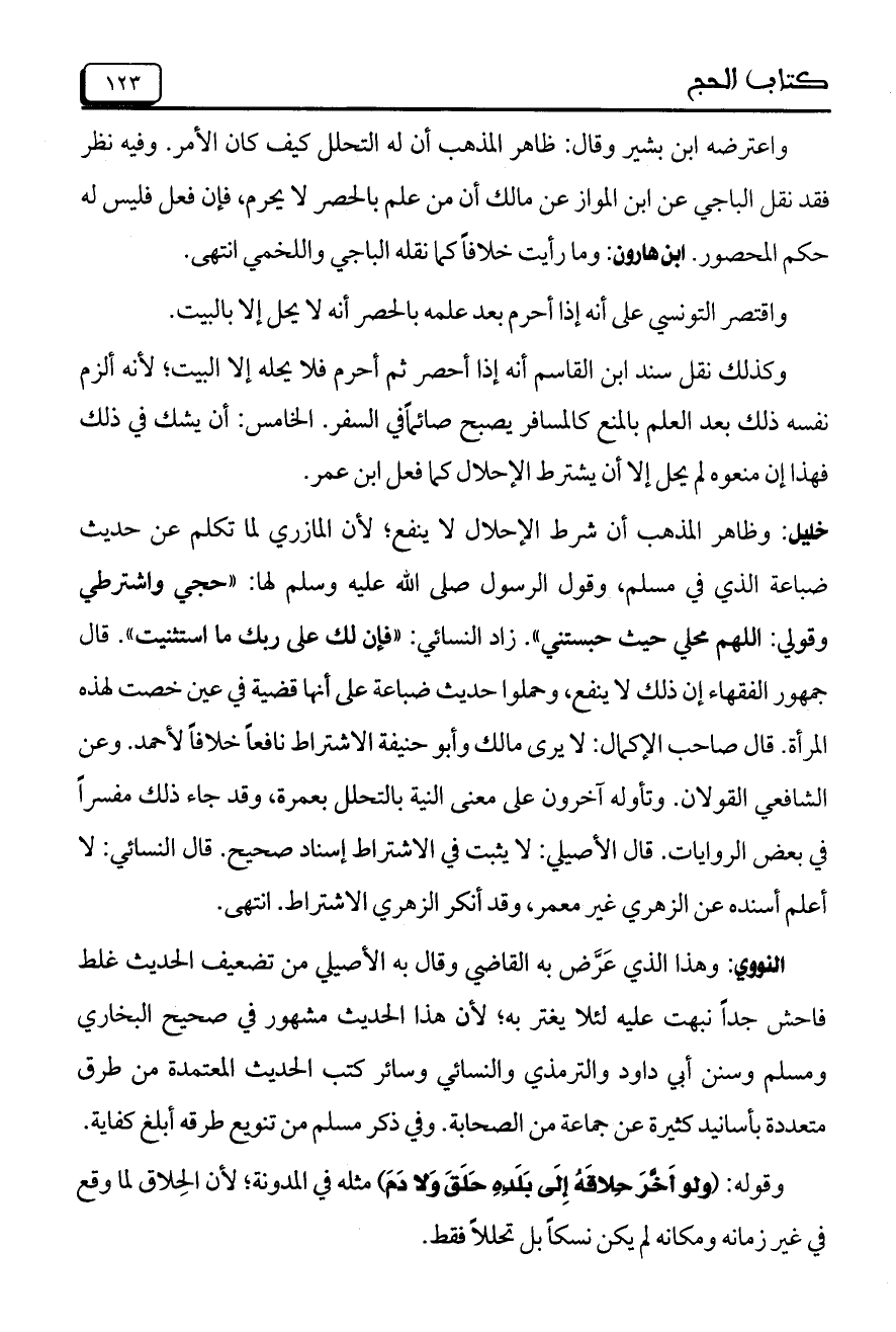 خليل: وظاهر المذهب أن شرط الإحلال لا ينفع؛ لأن الازري لما تكلم عن حديث ضباعة الذي في مسلم، وقول الرسول صلى الله عليه وسلم لها: "حجي واشترطي وقولي: اللهم محلي حيث حبستني". زاد النسائي: "فإن لك على ربك ما استثنيت". قال جمهور الفقهاء إن ذلك لا ينفع، وحملوا حديث ضباعة على أنها قضية في عين خصت لهذه المرأة. قال صاحب الإكمال: لا يرى مالك وأبو حنيفة الاشتراط نافعا خلافا لأحمد. وعن الشافعي القولان. وتأوله آخرون على معنى النية بالتحلل بعمرة، وقد جاء ذلك مفسراً في بعض الروايات. قال الأصيلي: لا يثبت في الاشتراط إسناد صحيح. قال النسائي: لا أعلم أسنده عن الزهري غير معمر، وقد أنكر الزهري الاشتراط. انتهى.