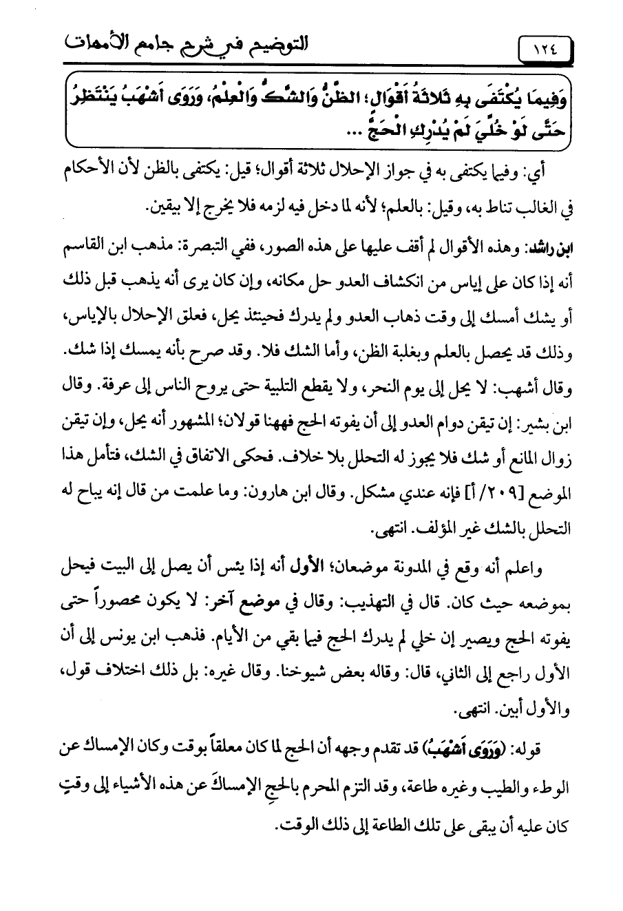 وقال أشهب: لا يحل إلى يوم النحر، ولا يقطع التلبية حتى يروح الناس إلى عرفة. وقال ابن بشير: إن تيقن دوام العدو إلى أن يفوته الحج فههنا قولان؛ المشهور أنه يحل، وإن تيقن زوال المانع أو شك فلا يجوز له التحلل بلا خلاف. فحكى الاتفاق في الشك، فتأمل هذا الموضع [209/أ] فإنه عندي مشكل. وقال ابن هارون: وما علمت من قال إنه يباح له التحلل بالشك غير المؤلف. انتهى.