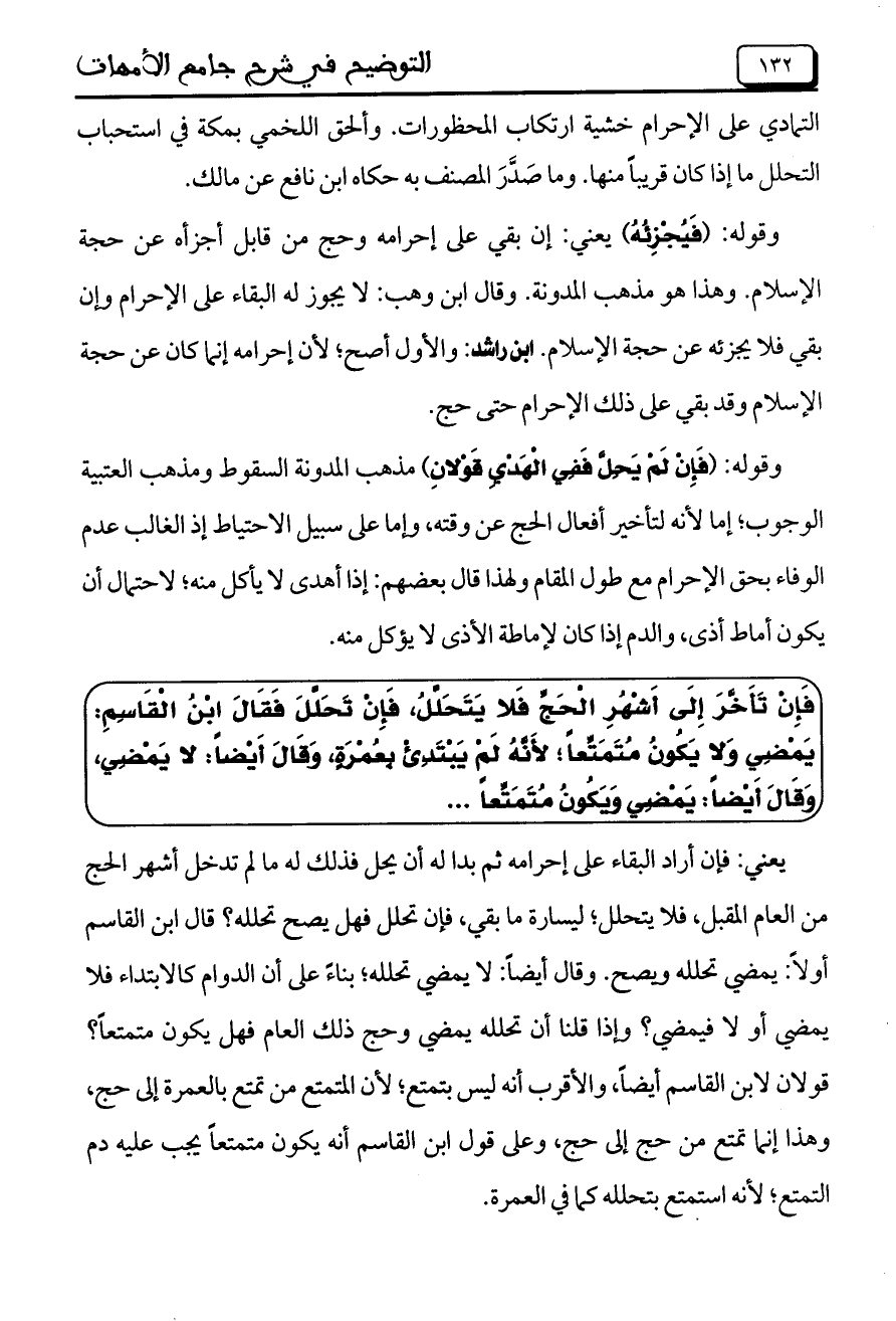 وقوله: (فَإِنْ لَمْ يَحِلَّ فَفِي الْهَدْيِ قَوْلانِ) مذهب المدونة السقوط ومذهب العتبية الوجوب؛ إما لأنه لتأخبر أفعال الحج عن وقته، وإما على سبيل الاحتياط إذا الغالب عدم الوفاء بحق الإحرام مع طول المقام ولهذا قال بعضهم: إذا أهدى لا يأكل منه؛ لاحتمال أن يكون أماط أذى، والدم إذا كان لإماطة الأذى لا يؤكل منه.