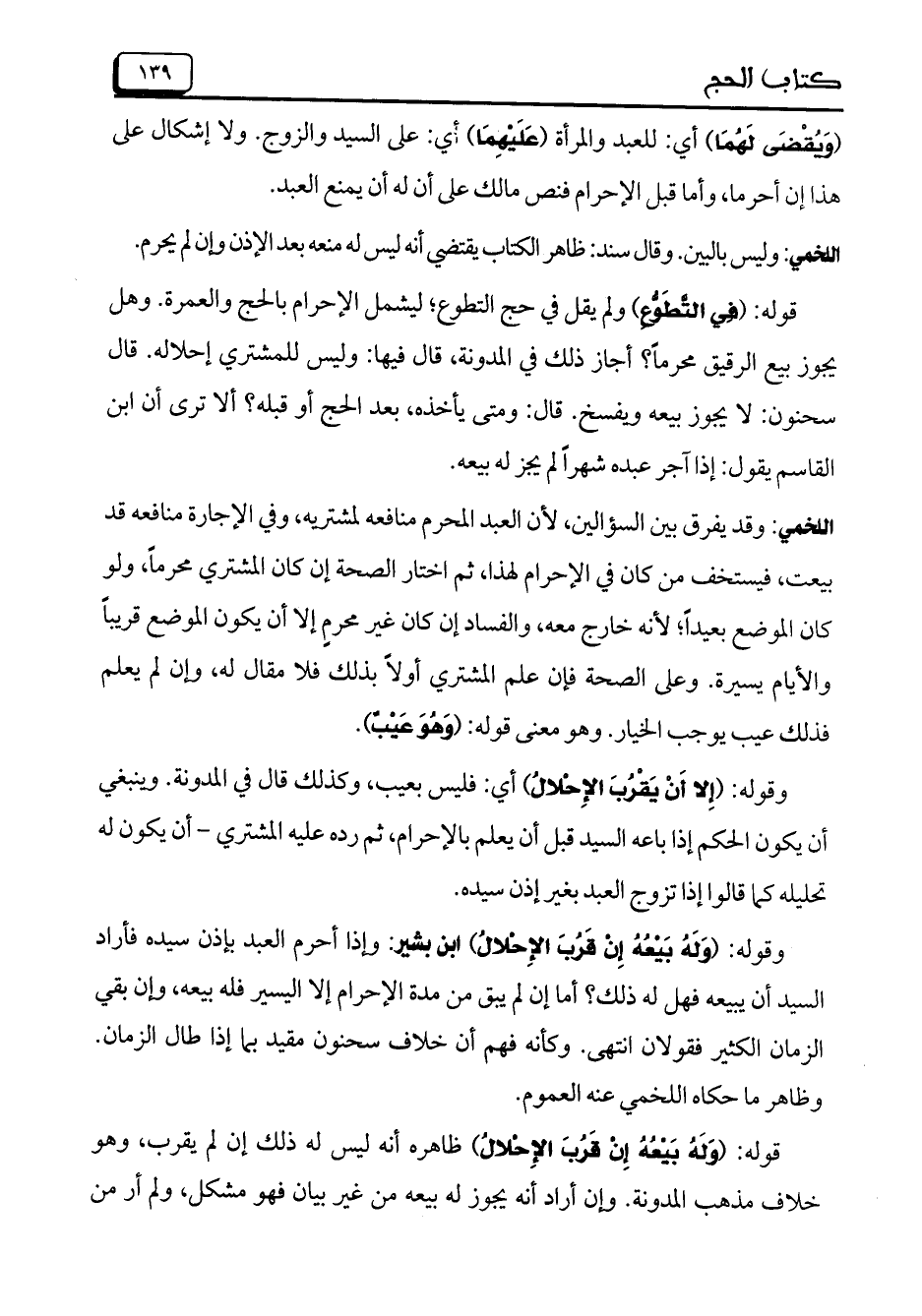 وقوله: (إِلا أَنْ يَقْرُبَ الإِحْلالُ) أي: فليس بعيب، وكذلك قال في المدونة. وينبغي أن يكون الحكم إذا باعه السيد قبل أن يعلم بالإحرام، ثم رده عليه المشتري – أن يكون له تحليله كما قالوا إذا تزوج العبد بغير إذن سيده.