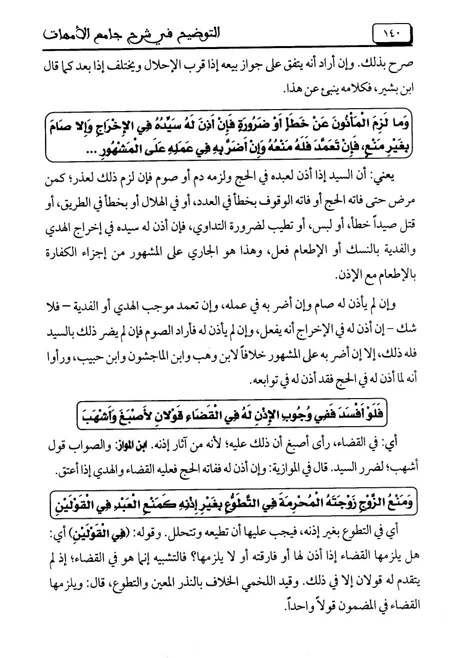 وإن لم يأذن له صام وإن أضر به في عمله، وإن تعمد موجب الهدي أو الفدية – فلا شك – إن أذن له في الإخراج أنه يفعل، وإن لم يأذن له فأراد الصوم فإن لم يضر ذلك بالسيد فله ذلك، إلا إن أضر به على المشهور خلافا لابن وهب وابن حبيب، ورأوا أنه لما أذن له في الحج فقد أذن له في توابعه.