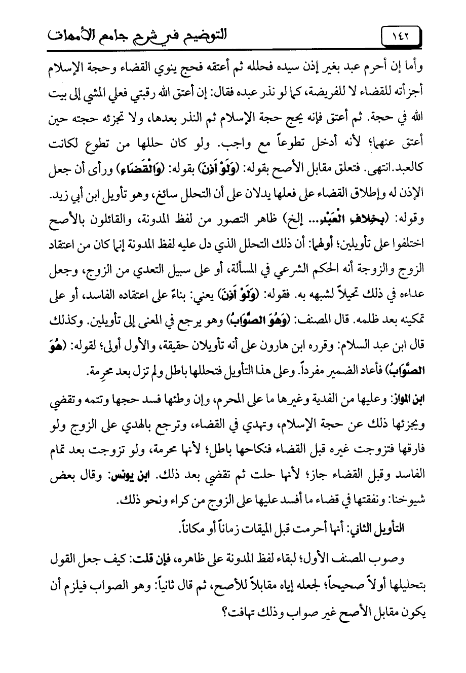 وأما إن أحرم عبد بغير إذن سيده فحلله ثم أعتقه فحج ينوي القضاء وحجة الإسلام أجزأته للقضاء لا للفريضة، كما لو نذر عبده فقال: إن أعتق الله رقبتي فعلي المشي إلى بيت الله في حجة. ثم أعتق فإنه يحج حجة الإسلام ثم النذر بعدها، ولا تجزئه حجته حين أعتق عنهما؛ لأنه أدخل تطوعا مع واجب. ولو كان حللها من تطوع لكانت كالعبد. انتهى. فتعلق مقابل الأصح بقوله: (وَلَوْ أَذِنَ) بقوله: (وَالْقَضَاءِ) ورأى أن جعل الإذن له وإطلاق القضاء على فعلها يدلان على التحلل سائغ، وهو تأويل ابن أبي زيد. وقوله: (بِخِلافِ الْعَبْدِ .... إلخ) ظاهر التصور من لفظ المدونة، والقائلون بالأصح اختلفوا على تأويلين؛ أولهما: أن ذلك التحلل الذي دل عليه لفظ المدونة إنما كان من اعتقاد الزوج والزوجة أنه الحكم الشرعي في المسألة، أو على سبيل التعدي من الزوج، وجعل عداءه في ذلك تحيلاً لشبهه به. فقوله: (وَلَوْ أَذِنَ) يعني: بناء على اعتقاده الفاسد، أو على تمكينه بعد ظلمه. قال المصنف: (وَهُوَ الصَّوَابُ) وهو يرجع في المعنى إلى تأويلين. وكذلك قال ابن عبد السلام: وقرره ابن هارون على أنه تأويلان حقيقة، والأول أولى؛ لقوله: (هُوَ الصَّوَابُ) فأعاد الضمير مفردا. وعلى هذا التأويل فتحللها باطل ولم تزل بعد محرمة.