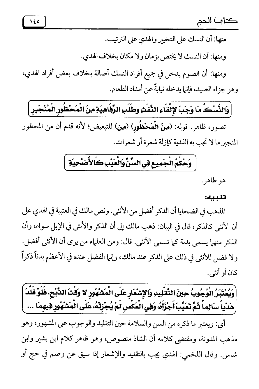 أي: ويعتبر ما ذكره من السن والسلامة حين التقليد والوجوب على المشهور، وهو مذهب المدونة، ومقتضى كلامه أن الشاذ منصوص، وهو ظاهر كلام ابن بشير وابن شاس. وقال اللخمي: الهدي يجب بالتقليد والأشعار إذا سيق عن وصم في حج أو