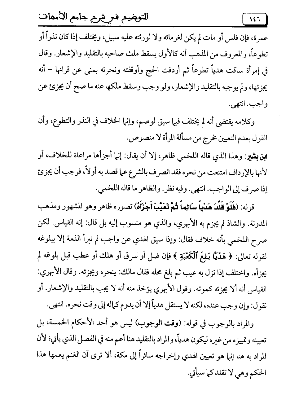 عمرة، فإن فلس أو مات لم يكن لغرمائه ولا لورثته عليه سبيل، ويختلف إذا كان نذراً أو تطوعاً، والمعروف من المذهب أنه كالأول يسقط ملك صاحبه بالتقليد والإشعار. وقال في إمرأة ساقت هدياً تطوعاً ثم أردفت الحج وأوقفته ونحرته بمنى عن قرانها - أنه يجزئها، ولم يوجبه بالتقليد والأشعار، ولو وجب وسقط ملكها عنه ما صح أن يجزئ عن واجب. انتهى.