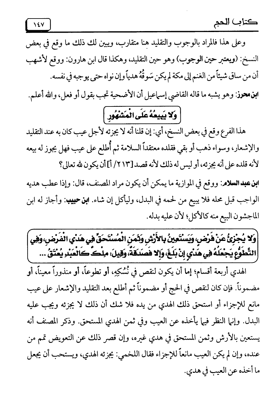 وعلى هذا فالمراد بالوجوب والتقليد هنا متقارب، ويبين لك ذلك ما وقع في بعض النسخ: (ويعتبر حين الوجوب) وهو حين التقليد، وهكذا قال ابن هارون: ووقع لأشهب أن من ساق شيئا من الغنم إلى مكة لم يكن سوقه هديا وإن نواه حتى يوجبه في نفسه.