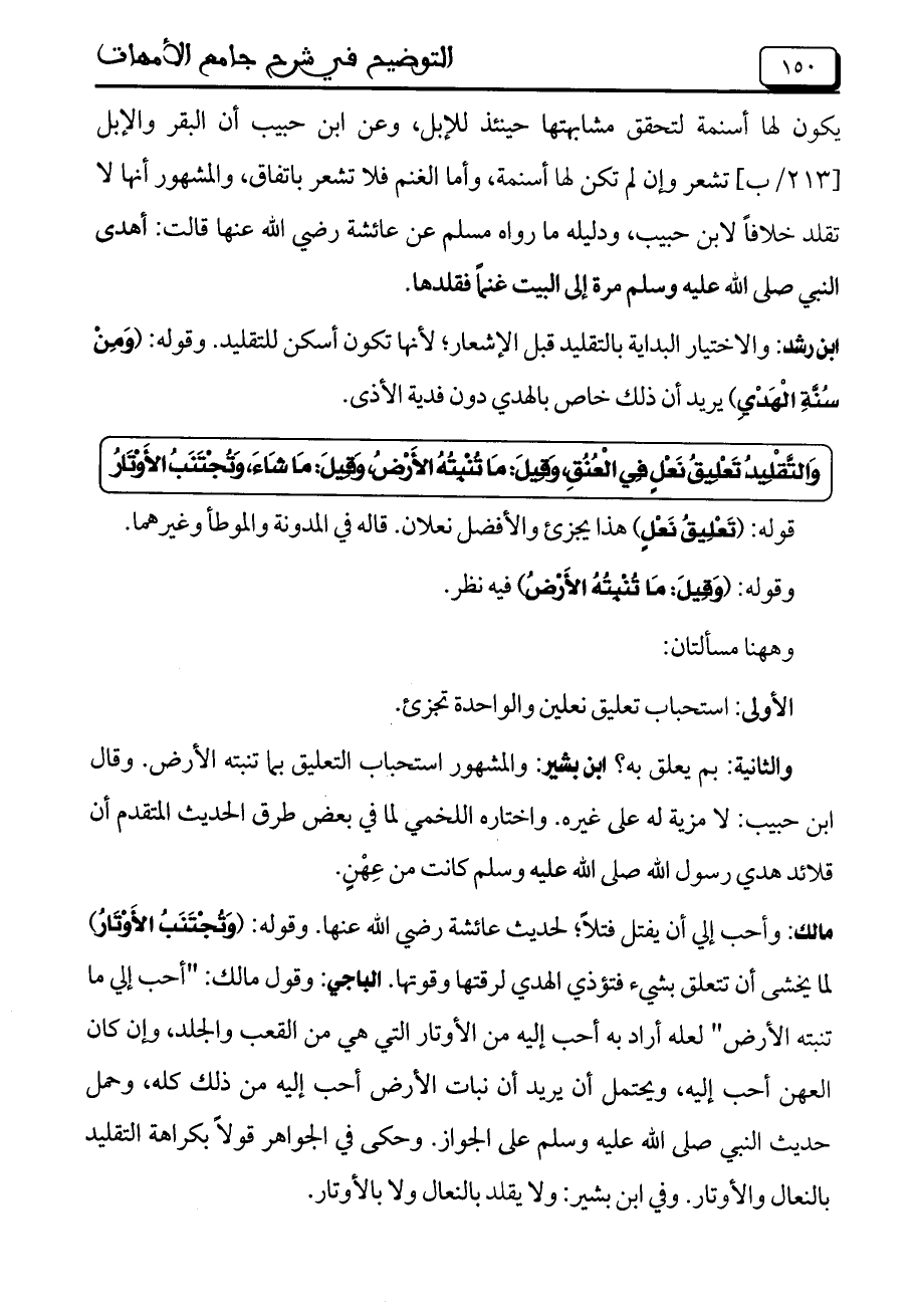 يكون لها أسنمة لتحقق مشابهتها حينئذ للإبل, وعن ابن حبيب أن البقر والإبل [213/ب] تشعر وإن لم تكن لها أسنمة, وأما الغنم فلا تشعر باتفاق, والمشهور أنها لا تقلد خلافاً لابن حبيب, ودليله ما رواه مسلم عن عائشة رضى الله عنها قالت: أهدى النبى صلى الله عليه وسلم مرة إلى البيت غنماً فقلدها.