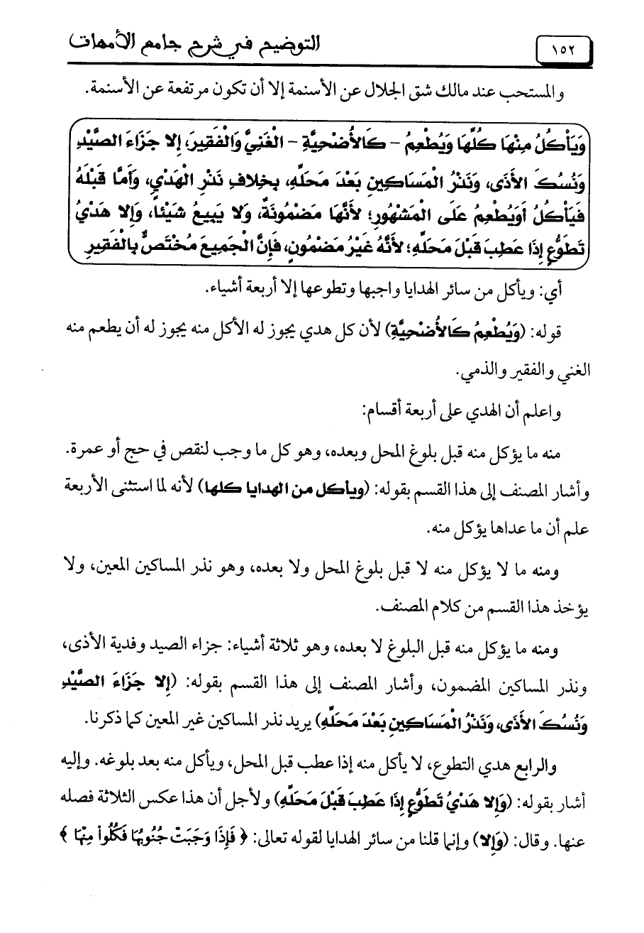 ومنه ما يؤكل منه قبل البلوغ لا بعده, وهو ثلاثة أشياء: جزاء الصيد وفدية الأذى, ونذر المساكين المضمون, وأشار المصنف إلى هذا القسم بقوله: (إِلا جَزَاءَ الصَّيْدِ وَنُسُكَ الأَذَى, وَنَذْرُ الْمَسَاكِينِ بَعْدَ مَحَلِّهِ) يريد نذر المساكين غير المعين كما ذكرنا.