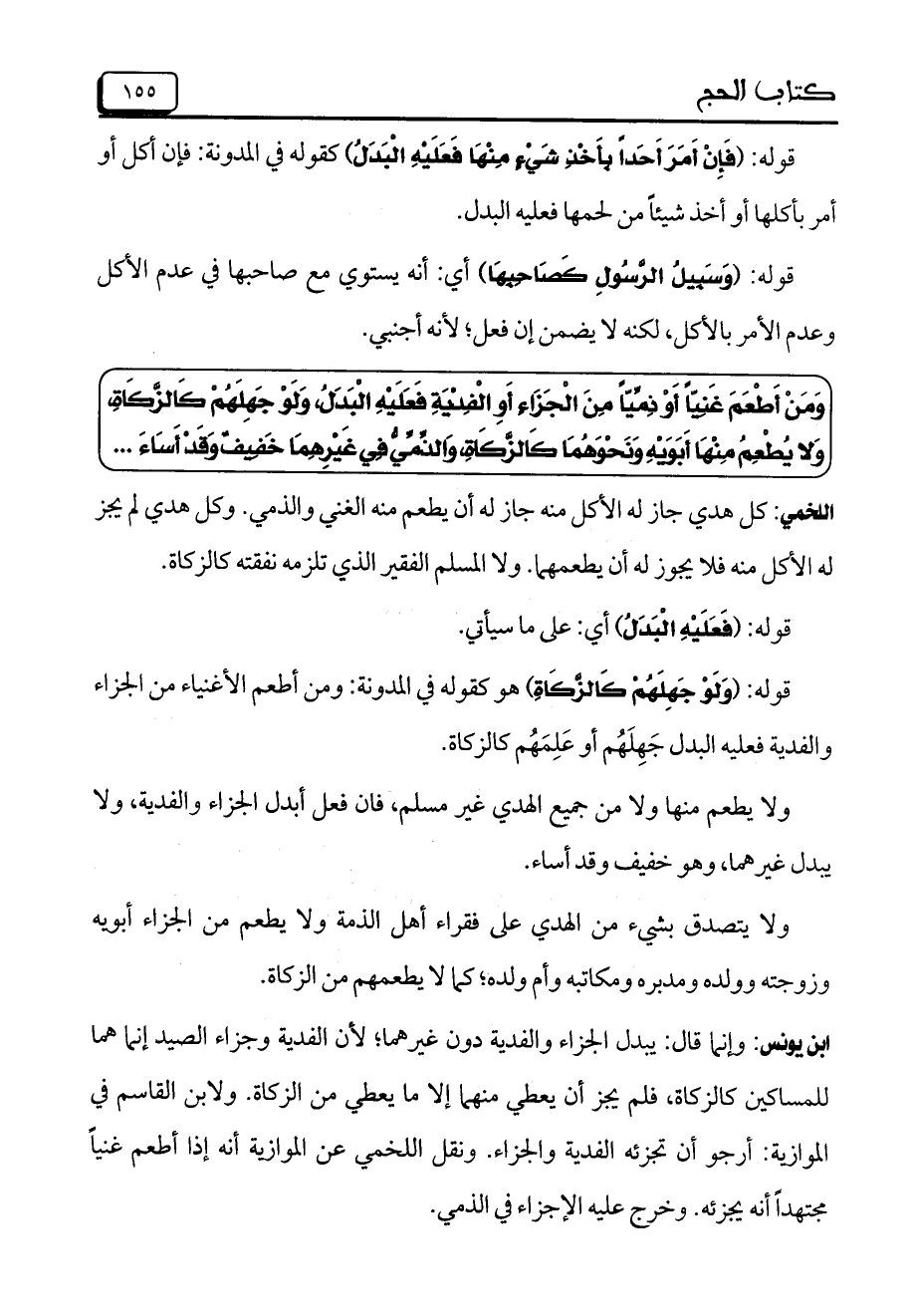 وَمَنْ أَطْعَمَ غَنِيّاً أَوْ ذِمِّيّاً مِنَ الْجَزَاءِ أَوْ الْفِدْيَةِ فَعَلَيْهِ الْبَدَلُ, وَلَوْ جَهِلَهُمْ كَالزَّكَاةِ, وَلا يُطْعِمُ مِنْهَا أَبَوَيْهِ وَنَحْوَهُمَا كَالزَّكَاةِ, وَالذِّمِّىُّ فِى غَيْرِهِمَا خَفِيفٌ وَقَدْ أَسَاءَ ...