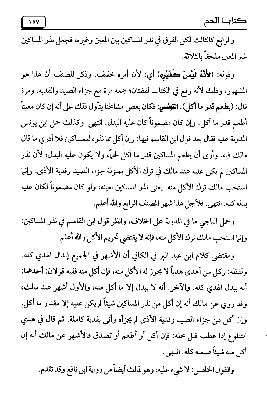 وكذلك حمل ابن يونس المدونة عليه فقال بعد قول ابن القاسم فيها: وإن أكل مما نذره للمساكين فلا أدرى ما قال مالك فيه, وأرى أن يطعم المساكين قدر ما أكل لحماً, ولا يكون عليه البدل؛ لأن نذر المساكين لم يكن عليه عند مالك فى ترك الأكل بمنزلة جزاء الصيد وفدية الأذى. وإنما استحب مالك ترك الأكل منه. يعنى نذر المساكين بعينه, ولو كان مضموناً لكان عليه بدله كله. انتهى. فلأجل هذا شهر المصنف الرابع والله أعلم.
