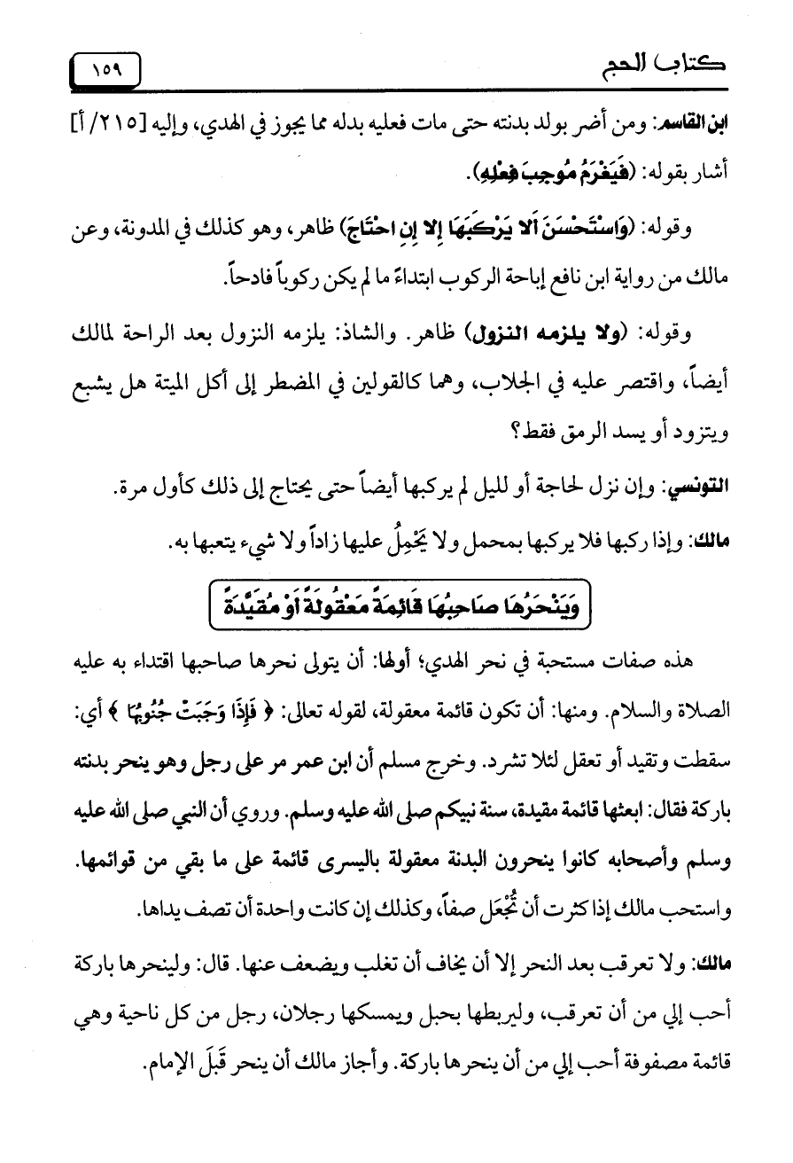مالك: ولا تعرقب بعد النحر إلا أن يخاف أن تغلب ويضعف عنها. قال: ولينحرها باركة أحب إلي من أن تعرقب, وليربطها بحبل ويمسكها رجلان, رجل من كل ناحية وهى قائمة مصفوفة أحب إلى من أن ينحرها باركة. وأجاز مالك أن ينحر قَبلَ الإمام.