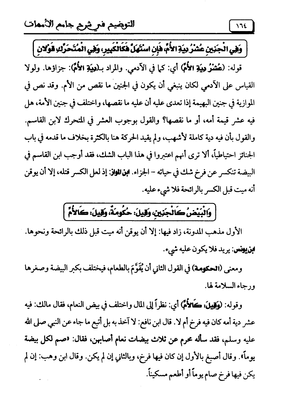 قوله: (عُشْرُ دِيَةِ الأُمِّ) أى: كما فى الآدمى. والمراد بـ (دِيَةِ الأُمِّ): جزاؤها. ولولا القياس على الآدمى لكان ينبغى أن يكون فى الجنين ما نقص من الأم. وقد نص فى الموازية فى جنين البهيمة إذا تعدى عليه أن عليه ما نقصها, واختلف فى جنين الأمة, هل فيه عشر قيمة أمه, أو ما نقصها؟ والقول بوجوب العشر فى المتحرك لابن القاسم. والقول بأن فيه دية كاملة لأشهب, ولم يقيد الحركة هنا بالكثرة بخلاف ما قدمه فى باب الجنائز احتياطياً, ألا ترى أنهم اعتبروا فى هذا الباب الشك, فقد أوجب ابن القاسم فى البيضة تنكسر عن فرخ شك فى حياته – الجزاء. ابن المواز: إذ لعل الكسر قتله, إلا أن يوقن أنه ميت قبل الكسر بالرائحة فلا شئ عليه.
