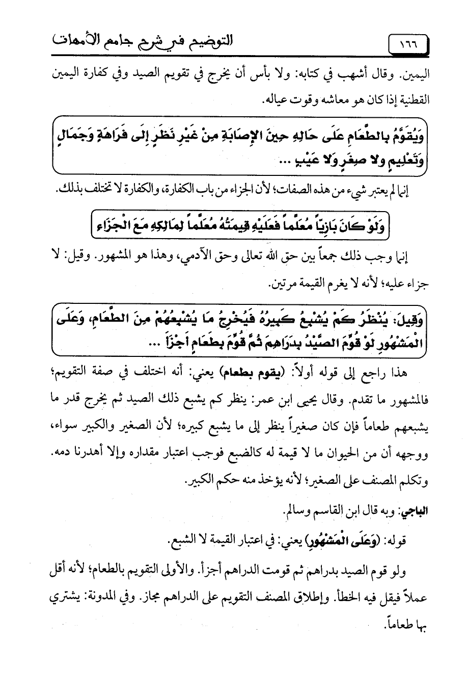 هذا راجع إلى قوله أولاً: (يقول بطعام) يعنى: أنه اختلف فى صفة التقويم؛ فالمشهور ما تقدم. وقال يحيى ابن عمر: ينظر كم يشبع ذلك الصيد ثم يخرج قدر ما يشبعهم طعاماً فإن كان صغيراً ينظر إلى ما يشبع كبيره؛ لأن الصغير والكبير سواء, ووجهه أن من الحيوان ما لا قيمة له كالضبع فوجب اعتباره مقداره وإلا أهدرنا دمه. وتكلم المصنف على الصغير؛ لأنه يؤخذ منه حكم الكبير.
