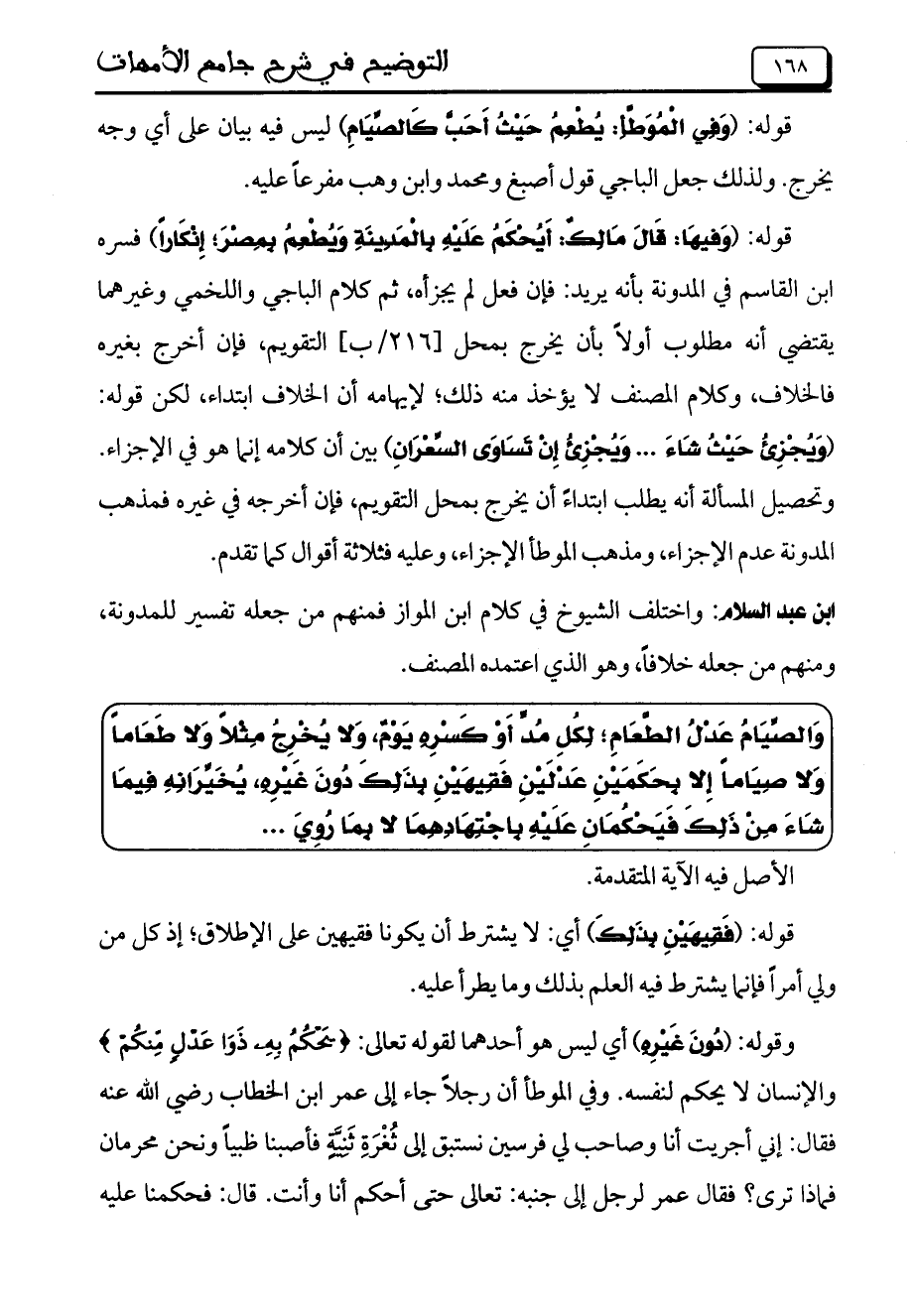 وَالصِّيَامُ عَدْلُ الطَّعَامِ؛ لِكُلِ مُدٍّ أَوْ كَسْرِهِ يَوْمٌ, وَلا يُخْرِجُ مِثْلاً وَلا طَعَاماً وَلا صِيَاماً إِلا بِحَكَمَيْنِ عَدْلَيْنِ فَقِيهَيْنِ بِذَلِك دُونَ غَيْرِهِ, يُخَيِّرَانِهِ فِيمَا شَاءَ مِنْ ذَلِكَ فَيَحْكُمَانِ عَلَيْهِ بِاجْتِهَادِهِمَا لا بِمَا رُوِىَ ...
