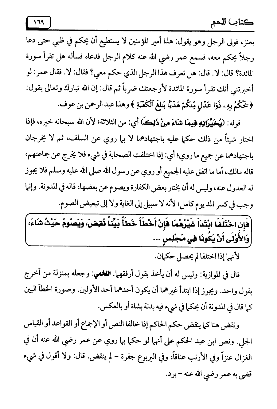 بعنز, فولى الرجل وهو يقول: هذا أمير المؤمنين لا يستطيع أن يحكم فى ظبى حتى دعا رجلاً يحكم معه, فسمع عمر رضى الله عنه كلام الرجل فدعاه فسأله هل تقرأ سورة المائدة؟ قال: لا. قال: هل تعرف هذا الرجل الذى حكم معى؟ فقال: لا. فقال عمر: لو أخبرتنى أنك تقرأ سورة المائدة لأوجعتك ضرباً ثم قال: إن الله تبارك وتعالى يقول: (يَحْكُمُ بِهِ ذَوَا عَدْلٍ مِنْكُمْ هَدْياً بَالِغَ الْكَعْبَةِ (وهذا عبد الرحمن بن عوف.
