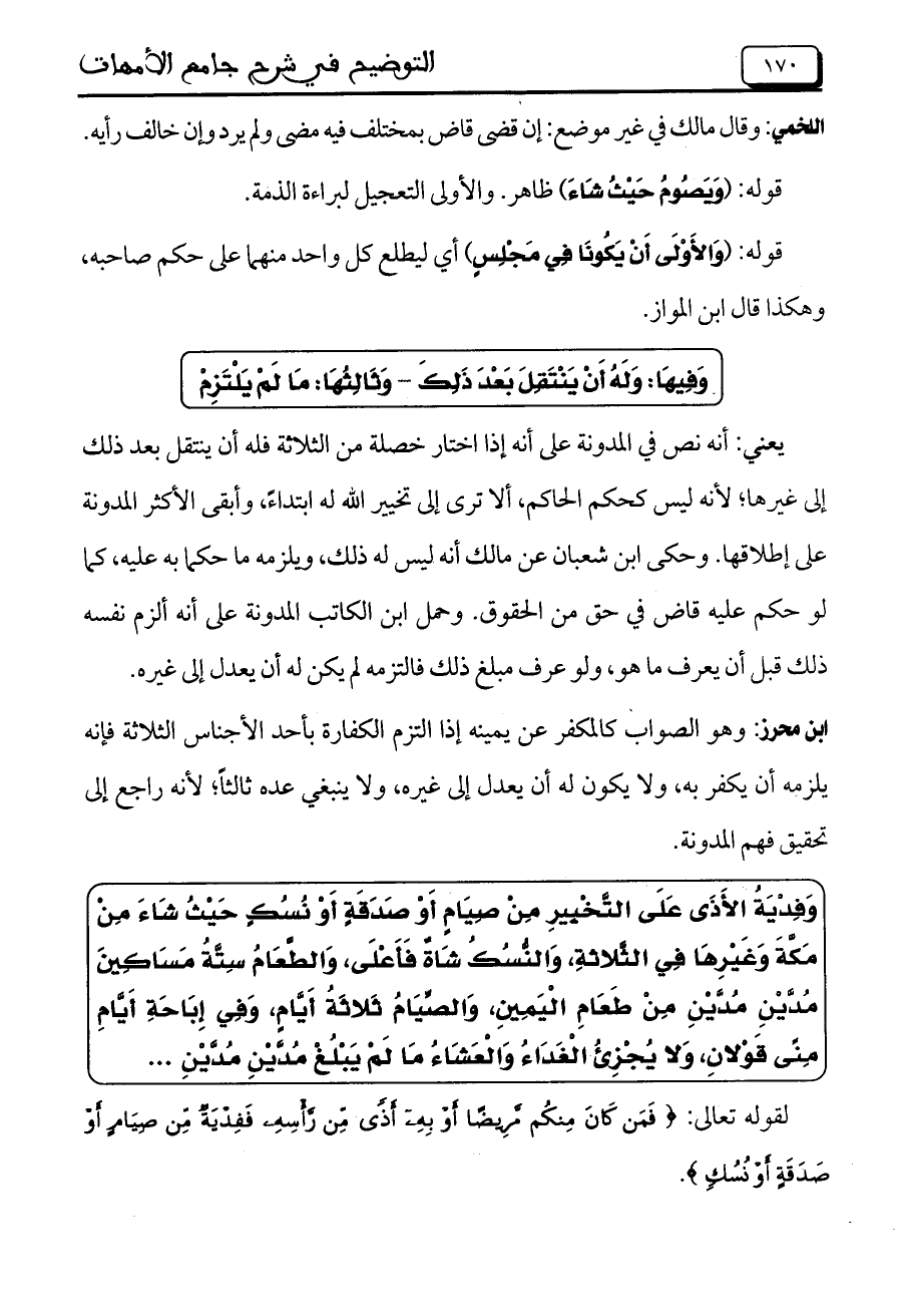 ابن محرز: وهو الصواب كالمكفر عن يمينه إذا التزم الكفارة بأحد الأجناس الثلاثة فإنه يلزمه أن يكفر به, ولا يكون له أن يعدل إلى غيره, ولا ينبغى عذه ثالثاً؛ لأنه راجع إلى تحقيق فهم المدونة.
