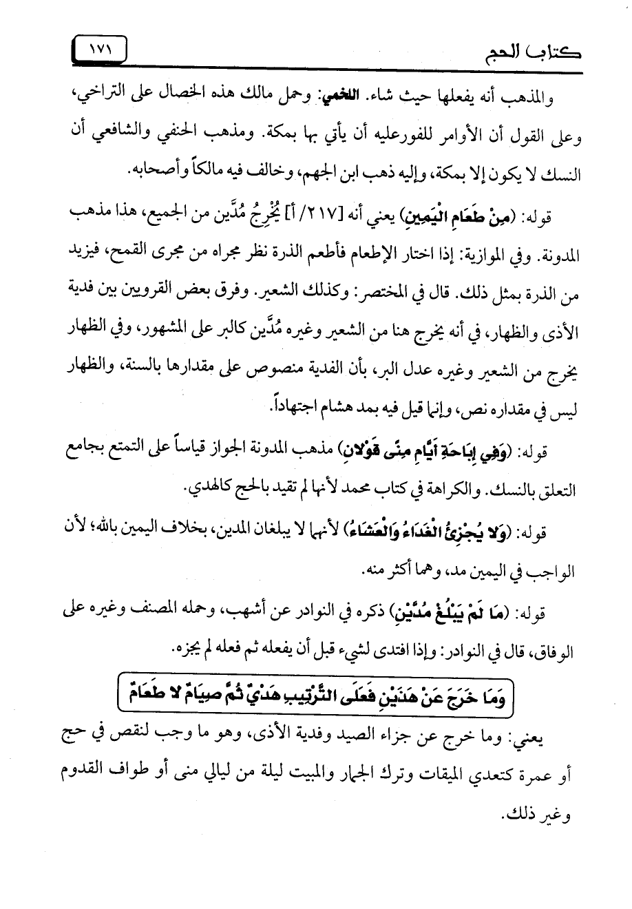 قوله: (مِنْ طَعَامِ الْيَمِينِ) يعنى أنه [217/أ] يُخْرِجُ مُدَّين من الجميع, هذا مذهب المدونة. وفى الموازية: إذا اختار الإطعام فأطعم الذرة نظر مجراه من مجرى القمح, فيزيد من البذرة بمثل ذلك. قال فى المختصر: وكذلك الشعير. وفرق بعض القرويين بين فية الأذى والظهار, فى أنه يخرج هنا من الشعير وغيره مُدين كالبر على المشهور, وفى الظهار يخرج من الشعير وغيره عدل البر, بأن الفدية منصوص على مقدارها بالسنة, والظهار ليس فى مقداره نص, وإنما قيل فيه بمد هشام اجتهاداً.