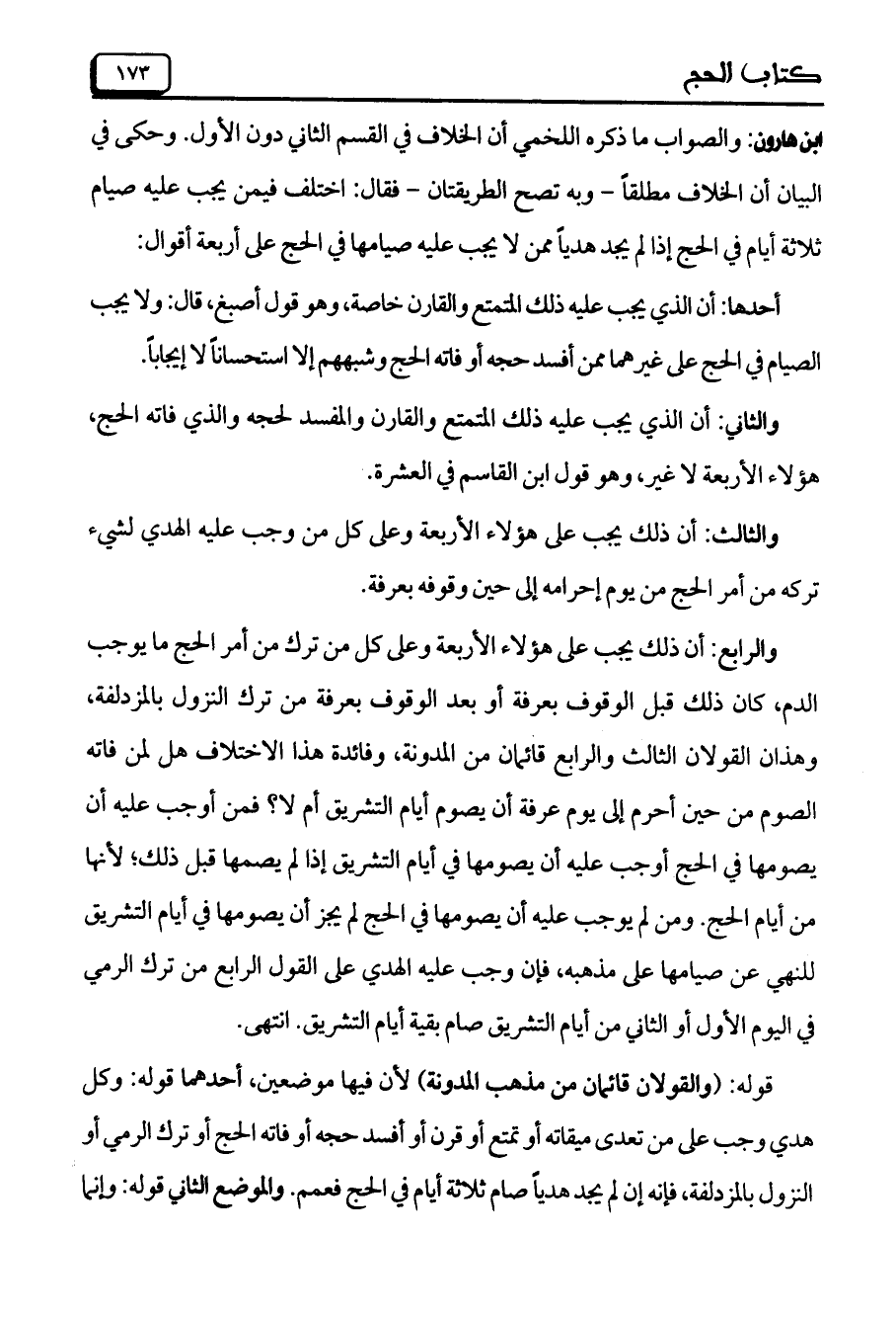 والرابع: أن ذلك يجب على هؤلاء الأربعة وعلى كل من ترك من أمر الحج ما يوجب الدم, كان ذلك قبل الوقوف بعرفة أو بعد الوقوف بعرفة من ترك النزول بالمزدلفة, وهذان القولان الثالث والرابع قائمان من المدونة, وفائدة هذا الاختلاف هل لمن فاته الصوم من حين أحرم إلى يوم عرفة أن يصوم أيام التشريق أم لا؟ فمن أوجب عليه أن يصومها فى الحج أو جب عليه أن يصومها فى أيام التشريق إذا لم يصمها قبل ذلك؛ لأنها من أيام الحج. ومن لم يوجب عليه أن يصومها فى الحج لم يجز أن يصومها فى أيام التشريق للنهى عن صيامها على مذهبه, فإن وجب عليه الهدى على القول الرابع من ترك الرمى فى اليوم الأول أو الثانى من أيام التشريق صام بقية أيام التشريق. انتهى.
