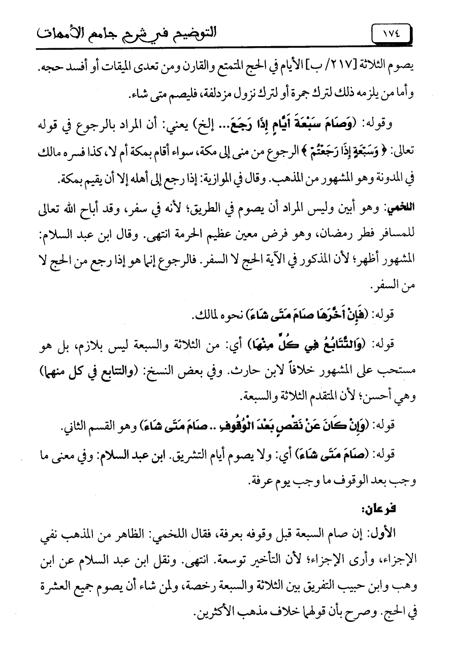 اللخمى: وهو أبين وليس المراد أن يصوم فى الطريق؛ لأنه فى سفر, وقد أباح الله تعالى للمسافر فطر رمضان, وهو فرض معين عظيم الحرمة انتهى. وقال ابن عبد السلام: المشهور أظهر؛ لأن المذكور فى الآية الحج لا السفر. فالرجوع إنما هو إذا رجع من الحج لا من السفر.