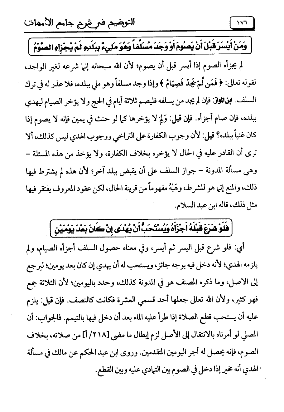 لم يجزأه الصوم إذا أيسر قبل أن يصوم؛ لأن الله سبحانه إنما شرعه لغير الواجد, لقوله تعالى: (فَمَنْ لَمْ يَجِدْ فَصِيَام (وإذا وجد مسلفاً وهو ملي ببلده, فلا عذر له فى ترك السلف. ابن المواز: فإن لم يجد من يسلفه فليصم ثلاثة أيام فى الحج ولا يؤخر الصيام ليهدى ببلده, فإن صام أجزأه. فإن قيل: وَلِمَ لا يؤخرها كما لو حنث فى يمين فإنه لا يصوم إذا كان غنياً ببلده؟ قيل: لأن وجوب الكفارة على التراخى ووجوب الهدى ليس كذلك, ألا ترى أن القادر عليه فى الحال لا يؤخره بخلاف الكفارة, ولا يؤخذ من هذه المسئلة –وهى مسألة المدونة- جواز السلف على أن يقبض ببلد آخر؛ لأن هذه لم يشترط فيها ذلك, والمنع إنما هو للشرط, وهَبْهُ مفهوماً من قرينة الحال, لكن عقود المعروف يفتقر فيها مثل ذلك, قاله ابن عبد السلام.