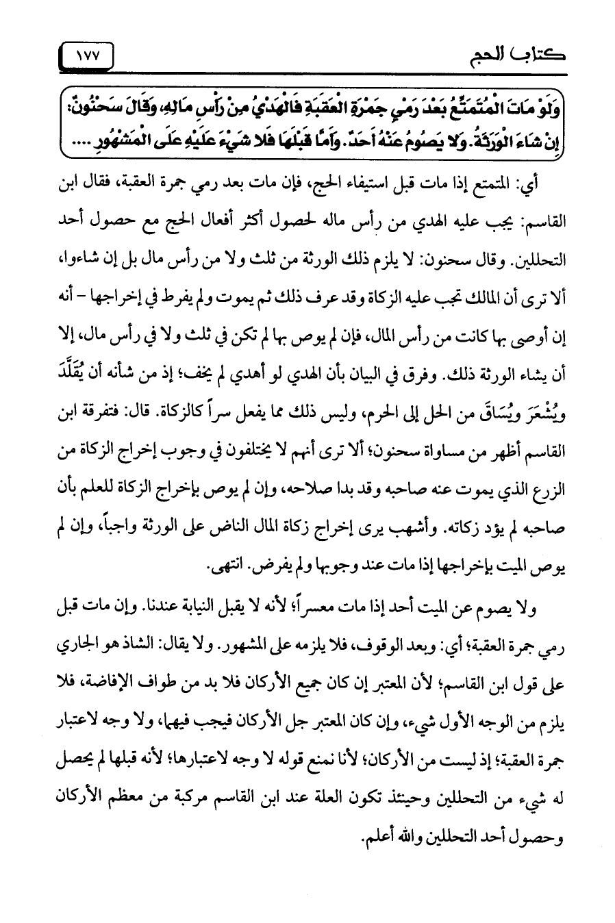 أى: المتمتع إذا مات قبل استيفاء الحج, فإن مات بعد رمى جمرة العقبة, فقال ابن القاسم: يجب عليه الهدى من رأس ماله أكثر أفعال الحج مع حصول أحد التحللين. وقال سحنون: لا يلزم ذلك الورثة من ثلث ولا من رأس مال بل إن شاءوا, ألا ترى أن المالك تجب عليه الزكاة وقد عرف ذلك ثم يموت ولم يفرط فى إخراجها –أنه إن أوصى بها كانت من رأس المال, فإن لم يوص بها لم تكن فى ثلث ولا فى رأس مال, إلا أن يشاء الورثة ذلك. وفرق فى البيان بأن الهدى لو أهدى لم يخف؛ إذ من شأنه أن يُقَلَّدَ ويشعر ويساق من الحل إلى الحرم, وليس ذلك مما يفعل سراً كالزكاة. قال: فتفرقة ابن القاسم أظهر من مساواة سحنون؛ ألا ترى أنهم لا يختلفون فى وجوب إخراج الزكاة من الزرع الذى يموت عنه صاحبه وقد بدا صلاحه, وإن لم يوص بإخراج الزكاة للعلم بأن صاحبه لم يؤد زكاته. وأشهب يرى إخراج زكاة المال الناض على الورثة واجباً, وإن لم يوص الميت بإخراجها إذا مات عند وجوبها ولم يفرض. انتهى.