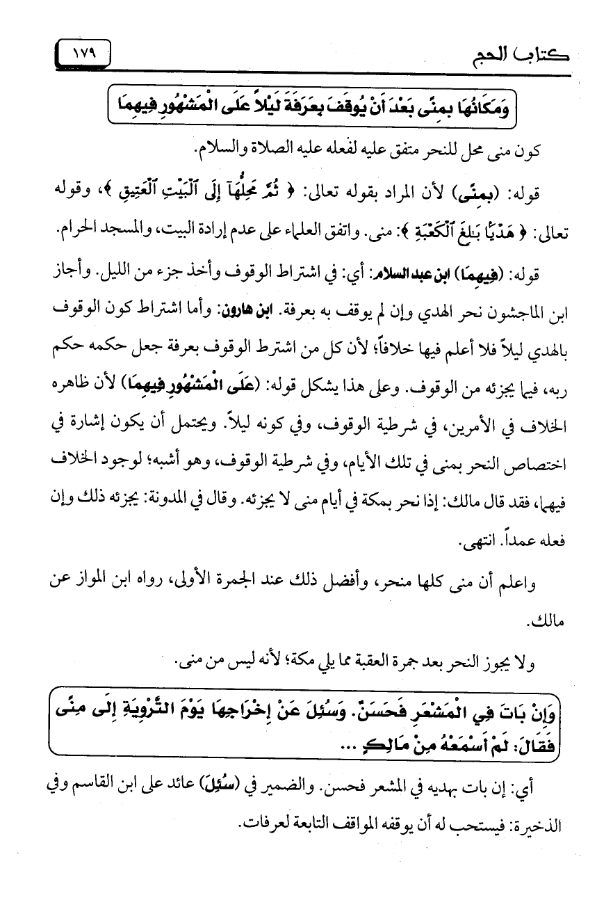 قوله: (فِيهِمَا) ابن عبد السلام: أى: فى اشتراط الوقوف وأخذ جزء من الليل. وأجاز ابن الماشجون نحر الهدى وإن لم يوقف به بعرفة. ابن هارون: وأما اشتراط كون الوقوف بالهدى ليلاً فلا أعلم فيها خلافاً؛ لأن كل من اشترط الوقوف بعرفة جعل حكمه حكم ربه, فيما يجزئه من الوقوف. وعلى هذا يشكل قوله: (عَلَى الْمَشْهُورِ فِيهِمَا) لأن ظاهره الخلاف فى الأمرين, فى شرطية الوقوف, وفى كونه ليلاً. ويحتمل أن يكون إشارة فى اختصاص النحر بمنى فى تلك الأيام, وفى شرطية الوقوف, وهو أشبه؛ لوجود الخلاف فيهما, فقد قال مالك: إذا نحر بمكة فى أيام منى لا يجزئه. وقال فى المدونة: يجزئه ذلك وإن فعله عمداً. انتهى.