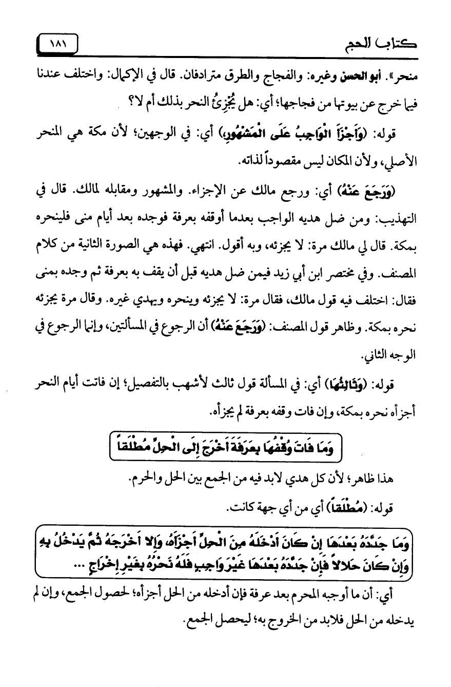 (وَرَجَعَ عَنْهُ) أى: ورجع مالك عن الإجزاء. والمشهور ومقابله لمالك. قال فى التهذيب: ومن ضل هديه الواجب بعدما أوقفه بعرفة فوجده بعد أيام منى فلينحره بمكة. قال لى مالك مرة: لا يجزئه, وبه أقول. انتهى. فهذه هى الصورة الثانية من كلام المصنف. وفى مختصر ابن أبى زيد فيمن ضل هديه قبل أن يقف به بعرفة ثم وجده بمنى فقال: اختلف فيه قول مالك, فقال مرة: لا يجزئه وينحره ويهدى غيره. وقال مرة يجزئه نحره بمكة. وظاهر قول المصنف: (وَرَجَعَ عَنْهُ) أن الرجوع فى المسألتين, وإنما الرجوع فى الوجه الثانى.