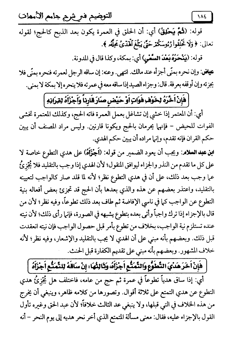 ابن عبد السلام: ويجب أن يعود الضمير من قوله: (أَجْزَاَهُ) على هدى التطوع خاصة لا على كل ما تقدم من النذر والجزاء ليوافق المنقول؛ لأن الهدى إذا وجب بالتقليد فلا يُجْزِئُ عما وجب بعد ذلك, على أن فى هدى التطوع نظر؛ لأنه لما قلد صار كالواجب لتعيينه بالتقليد, واعتذر بعضهم عن هذه والذى بعدها بأن الحج قد تجزىء بعض أفعاله بنية التطوع عن الواجب كما فى ناسى الإفاضة ثم طاف بعد ذلك تطوعاً, وفيه نظر؛ لأن من قال بالإجزاء إذا ترك واجباً وأتى بعده بتطوع يشبهه فى الصورة, فإنما رأى ذلك؛ لأن نيته عنده تستلزم نية الواجب, بخلاف من تطوع بأمر قبل حصول الواجب فإن نيته انعقدت قبل ذلك. وبعضهم بأنه مبنى على أن الهدى لا يجب بالتقليد والإشعار, وفيه نظر؛ لأنه خلاف المشهزر. وبعضهم بأنه مبنى على تقديم الكفارة قبل الحنث.