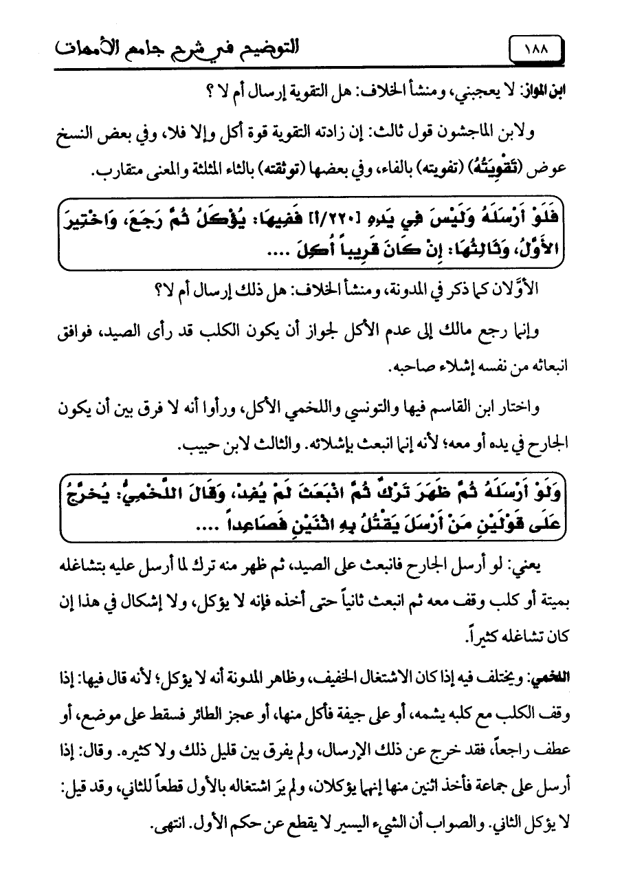 واختار ابن القاسم فيها والتونسى واللخمى الأكل, ورأوا أنه لا فرق بين أن يكون الجارح فى يده أو معه؛ لأنه إنما انبعث بإشلائه. والثالث لابن حبيب.