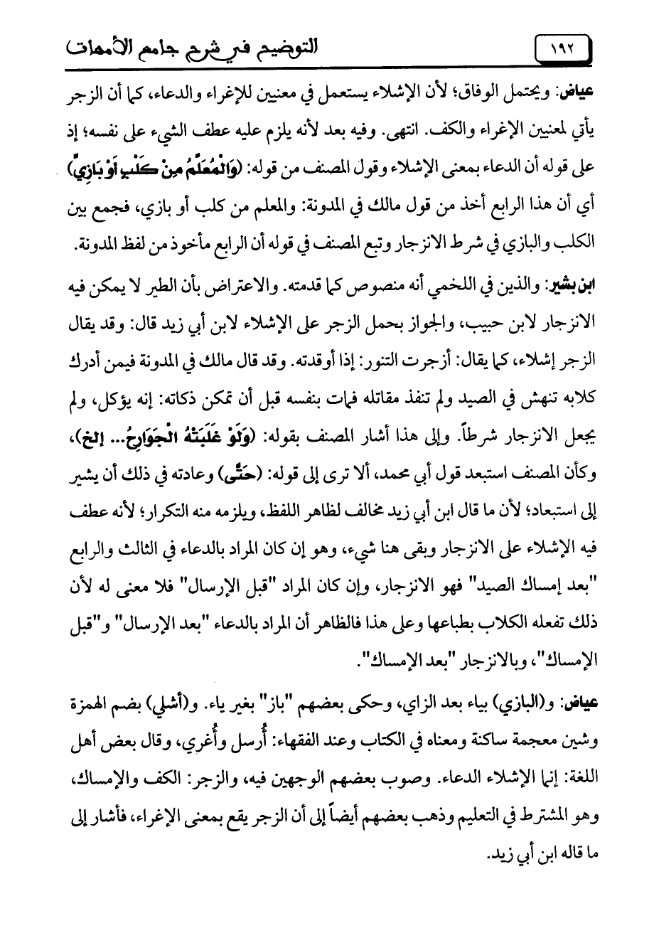 عياض: و (البازي) بياء بعد الزاي، وحكى بعضهم "باز" بغير ياء. و (أشلي) بضم الهمزة وشين معجمة ساكنة ومعناه في الكتاب وعند الفقهاء: أُرسل وأُغري، وقال بعض أهل اللغة: إنما الإشلاء الدعاء. وصوب بعضهم الوجهين فيه، والزجر: الكف والإمساك، وهو المشترط في التعليم وذهب بعضهم أيضاً إلى أن الزجر يقع بمعنى الإغراء، فأشار إلى ما قاله ابن أبي زيد.