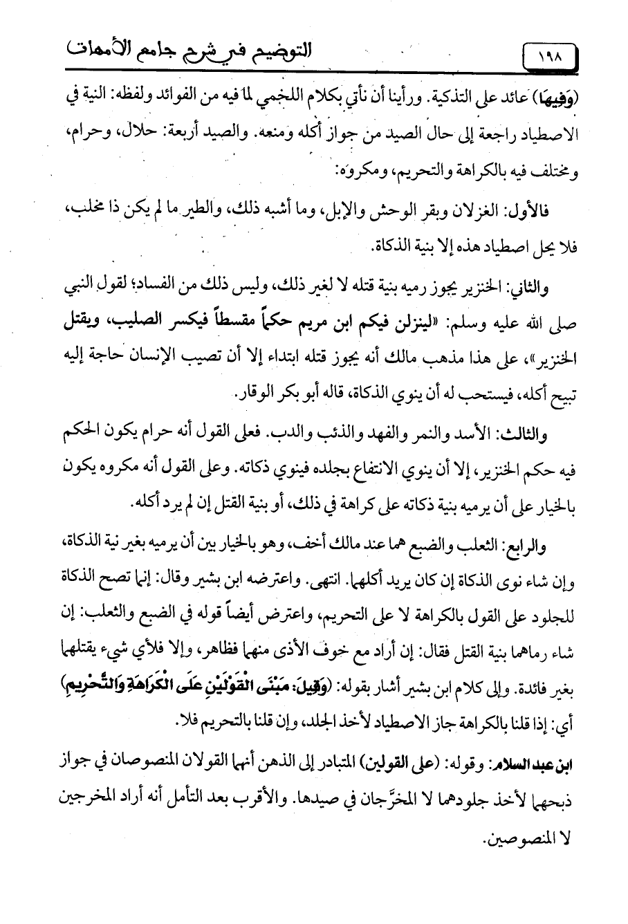ابن عبد السلام: وقوله: (على القولين) المتبادر إلى الذهن أنهما القولان المنصوصان في جواز ذبحهما لأخذ جلودهما لا المخرَّجان في صيدها. والأقرب بعد التأمل أنه أراد المخرجين لا المنصوصين.