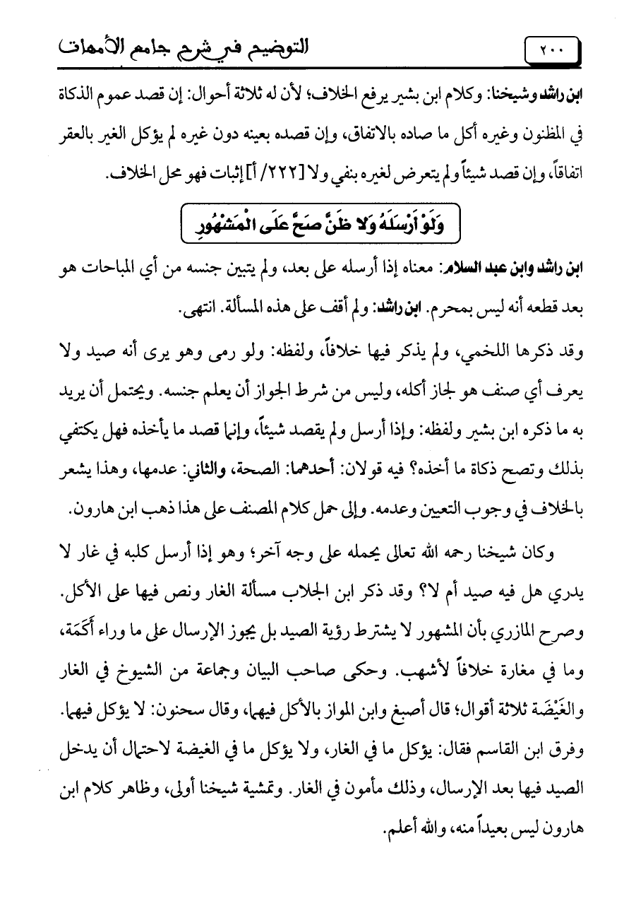 ابن راشد وشيخنا: وكلام ابن بشير يرفع الخلاف؛ لأن له ثلاثة أحوال: إن قصد عموم الذكاة في المظنون وغيره أكل ما صاده بالاتفاق، وإن قصده بعينه دون غيره لم يؤكل الغير بالعقر اتفاقاً، وإن قصد شيئاً ولم يتعرض لغيره بنفي ولا [222/أ] إثبات فهو محل الخلاف.