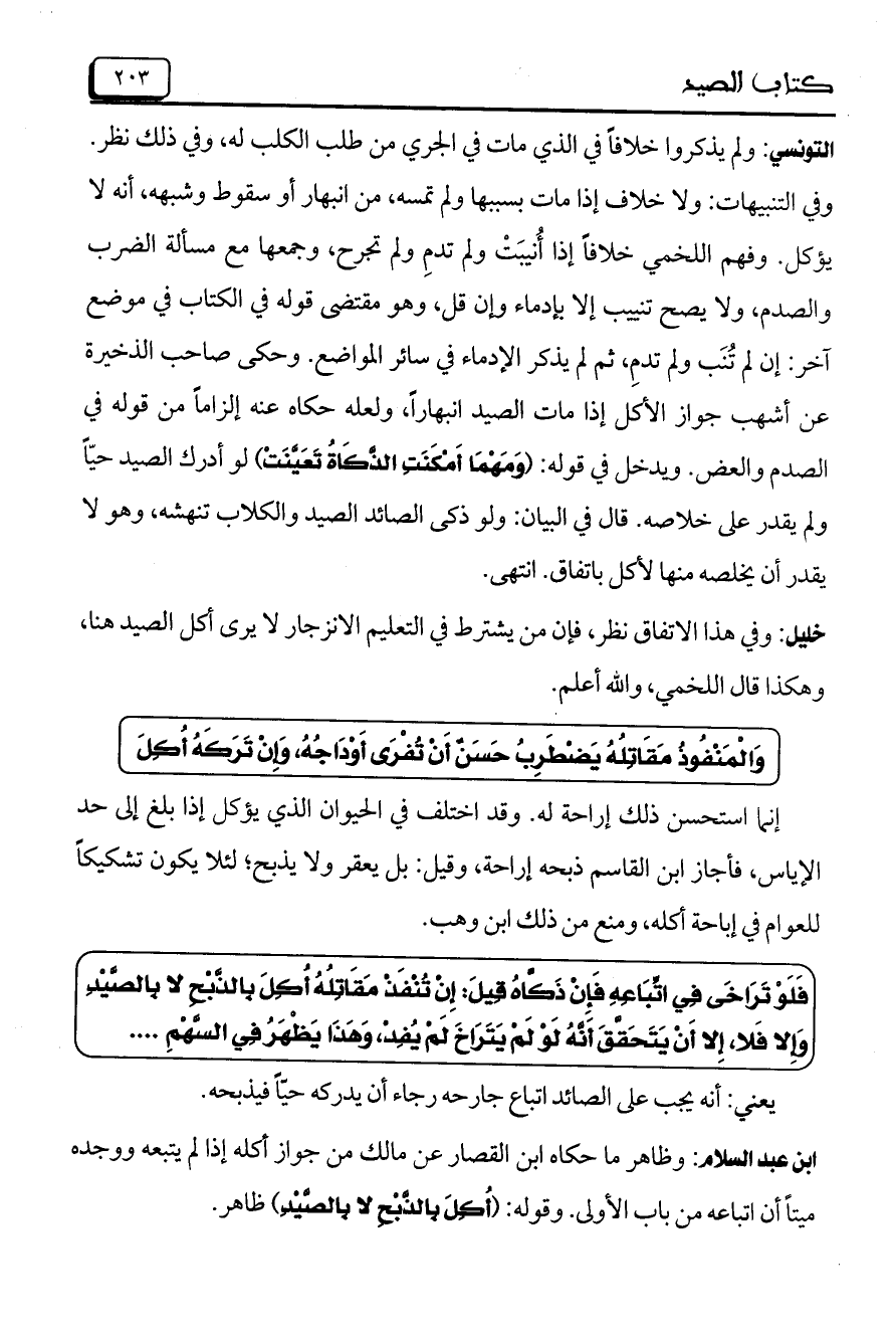 ابن عبد السلام: وظاهر ما حكاه ابن القصار عن مالك من جواز أكله إذا لم يتبعه ووجده ميتاً أن اتباعه من باب الأولى. وقوله: (أُكِلَ بالذَّبْحِ لا بالصَّيْدِ) ظاهر.