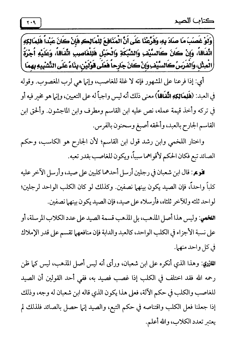 اللخمي: وليس هذا أصل المذهب، بل المذهب قسمة الصيد على عد الكلاب المرسلة، أو على نسبة الأجزاء في الكلب الواحد، كالعبد والدابة فإن منافعهما تقسم على قدر الإملاك في كل واحد منهما.