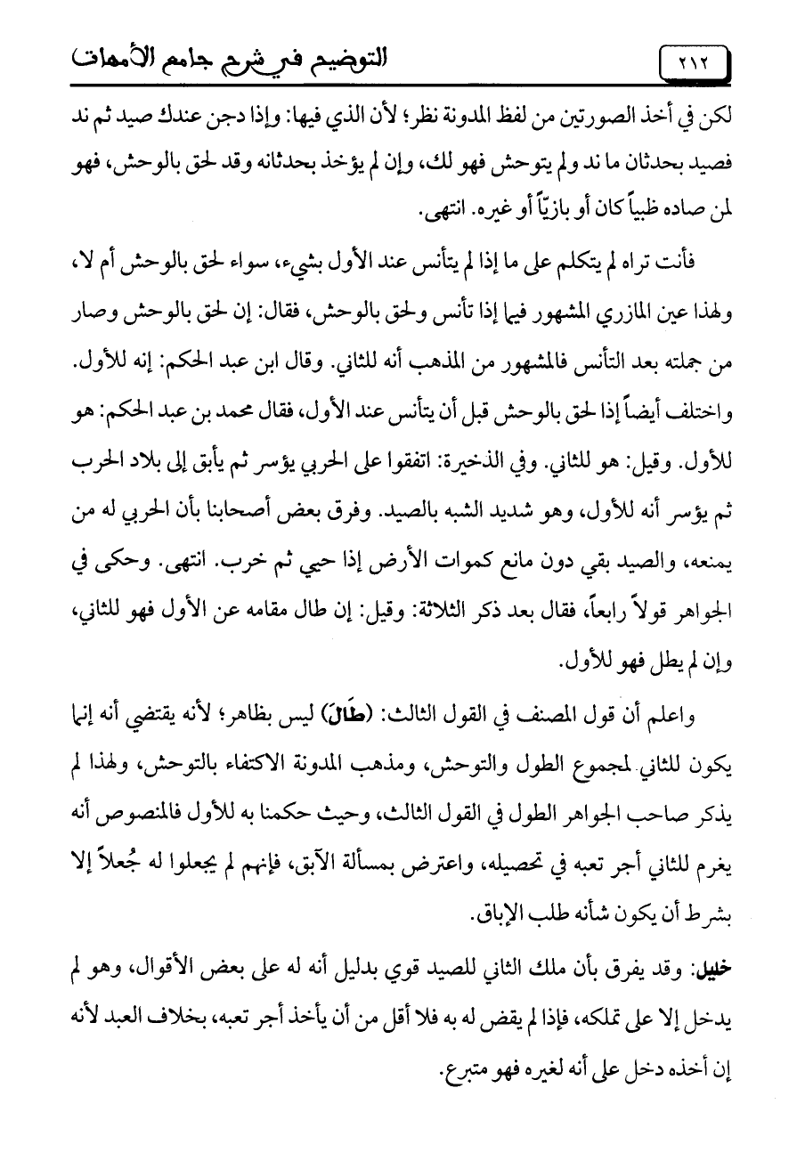 لكن في أخذ الصورتين من لفظ المدونة نظر؛ لأن الذي فيها: وإذا دجن عندك صيد ثم ند فصيد بحدثان ما عند ولم يتوحش فهو لك، وإن لم يؤخذ بحدثانه وقد لحق بالوحش، فهو لمن صاده ظبياً كان أو بازيّاً أو غيره. انتهى.