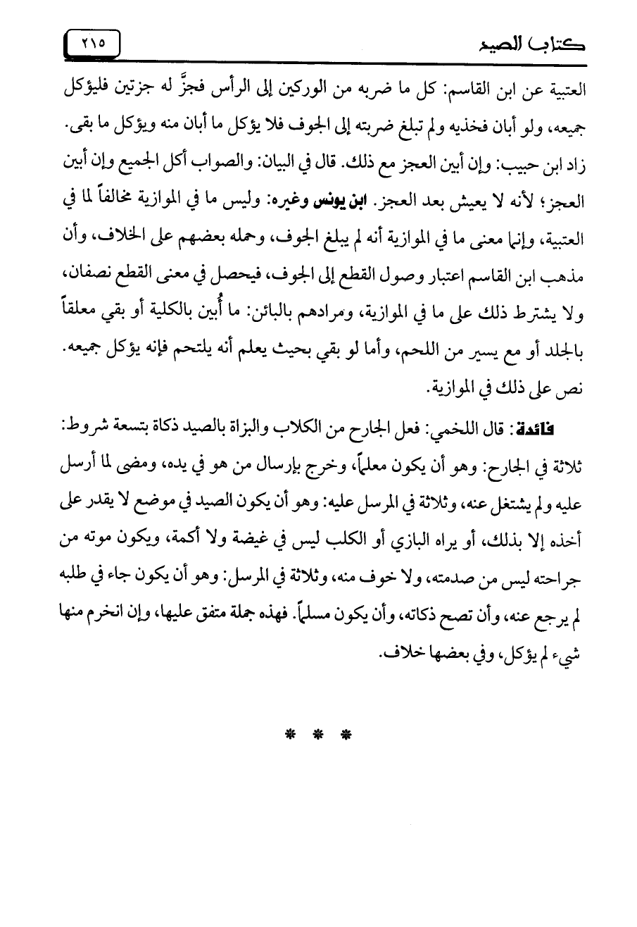 فائدة: قال اللخمي: فعل الجارح من الكلاب والبزاة بالصيد ذكاة بتسعة شروط: ثلاثة في الجارح: وهو أن يكون معلماً، وخرج بإرسال من هو في يده، ومضى لما أرسل عليه ولم يشتغل عنه، وثلاثة في المرسل عليه: وهو أن يكون الصيد في موضع لا يقدر على أخذه إلا بذلك، أو يراه البازي أو الكلب ليس في غيضة ولا أكمة، ويكون موته من جراحته ليس من صدمته، ولا خوف منه، وثلاثة في المرسل، وهو أن يكون جاء في طلبه لم يرجع عنه، وأن تصح ذكاته، وأن يكون مسلماً. فهذه جملة متفق عليها، وإن انخرم منها شيء لم يؤكل، وفي بعضها خلاف.