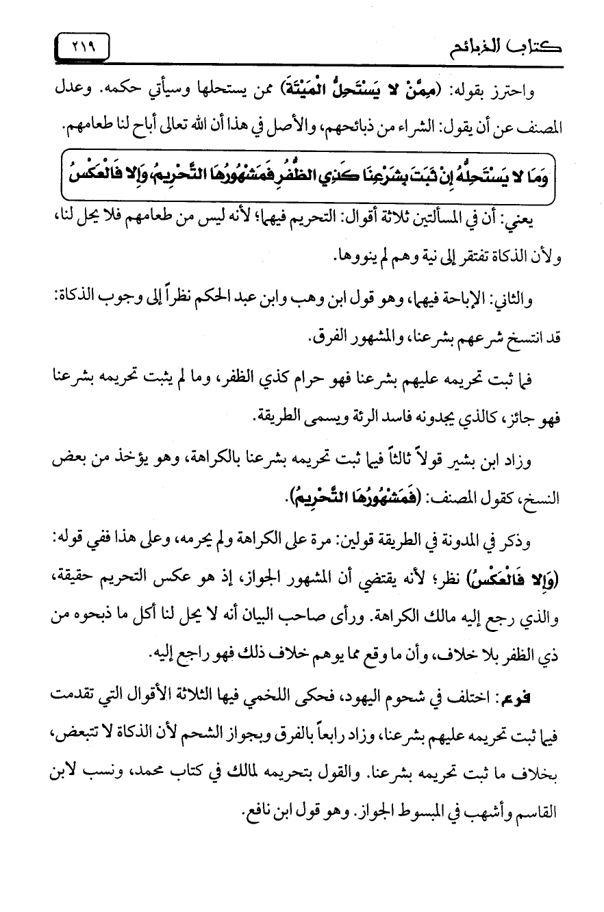 وذكر في المدونة في الطريقة قولين: مرة على الكراهة ولمي حرمه، وعلى هذا ففي قوله: (وَإِلا فَالْعَكْسُ) نظر؛ لأنه يقتضي أن المشهور الجواز، إذ هو عكس التحريم حقيقة، والذي رجع إليه مالك الكراهة. ورأى صاحب البيان أنه لا يحل لنا أكل ما ذبحوه من ذي الظفر بلا خلاف، وأن ما وقع مما يوهم خلاف ذلك فهو راجع إليه.