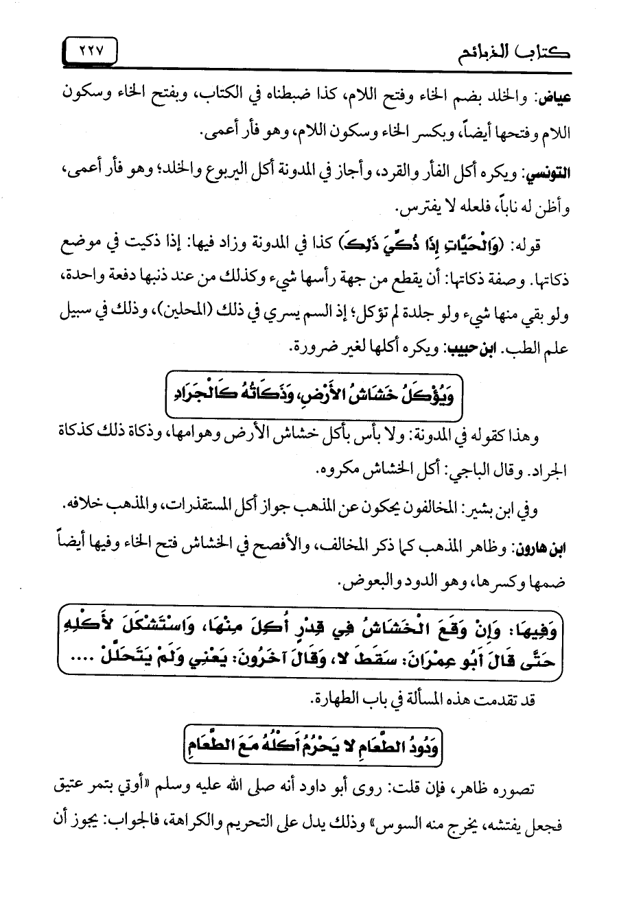 وهذا كقوله في المدونة: ولا بأس بأكل خشاش الأرض وهوامها، وذكاة ذلك كذكاة الجراد. وقال الباجي: أكل الخشاش مكروه.